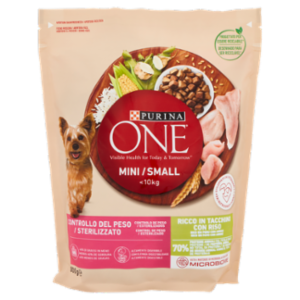 Per cani di piccola taglia meno attivi, in sovrappeso o sterilizzati. La polpa di barbabietola da zucchero aiuta a mantenere un microbioma intestinale sano, essenziale per la buona salute del tuo cane Senza coloranti, aromi artificiali e conservanti artificiali aggiunti Con il 40% di grassi in meno per contribuire a ridurre l'apporto calorico e a mantenere il peso forma. Altamente digeribile grazie a ingredienti di alta qualità Aiuta a supportare difese naturali forti grazie ad una speciale combinazione di antiossidanti e proteine di alta qualità Con uno specifico rapporto proteine/grassi per favorire una condizione corporea snella Sviluppato dai veterinari e dai nutrizionisti PURINA Piccole crocchette fragranti e deliziose e bocconi più morbidi° PURINA ONE⁽ ⁾Salute visibile oggi e domani PURINA ONE Mini/Small < 10kg Controllo del Peso / Sterilizzato è formulato per il tuo cane di piccola taglia meno attivo, in sovrappeso o sterilizzato ma che vuole comunque godersi il suo cibo. Una ricetta saporita ricca in Tacchino, preparata con il 40% di grassi in meno per contribuire a ridurre l'apporto calorico e aiutare il tuo cane a mantenere un corpo snello. Il tuo cane di piccola taglia ha esigenze nutrizionali specifiche. I nostri esperti PURINA hanno sviluppato una nutrizione avanzata e specifica che aiuta a mantenere sano il microbioma intestinale. Un pasto delizioso grazie a piccole fragranti crocchette e a bocconi più morbidi°. Progettato per essere riciclabile* *Questa confezione è progettata per essere riciclabile. Le modalità di raccolta e riciclo di questa confezione possono variare in ogni paese. Verifica sul sito www.purina.eu/packaging °morbidezza variabile nel tempo - Apertura salvafreschezza / Apertura facilitata - Progettato per essere riciclabile* - <10kg - Sviluppato dai veterinari e dai nutrizionisti PURINA - 40% di grassi in meno - Altamente digeribile - 70% Proteine animali sul totale delle proteine - Aiuta a mantenere un microbioma intestinale sano - *Questa confezione è progettata per essere riciclabile. Le modalità di raccolta e riciclo di questa confezione possono variare in ogni paese. Verifica sul sito www.purina.eu/packaging