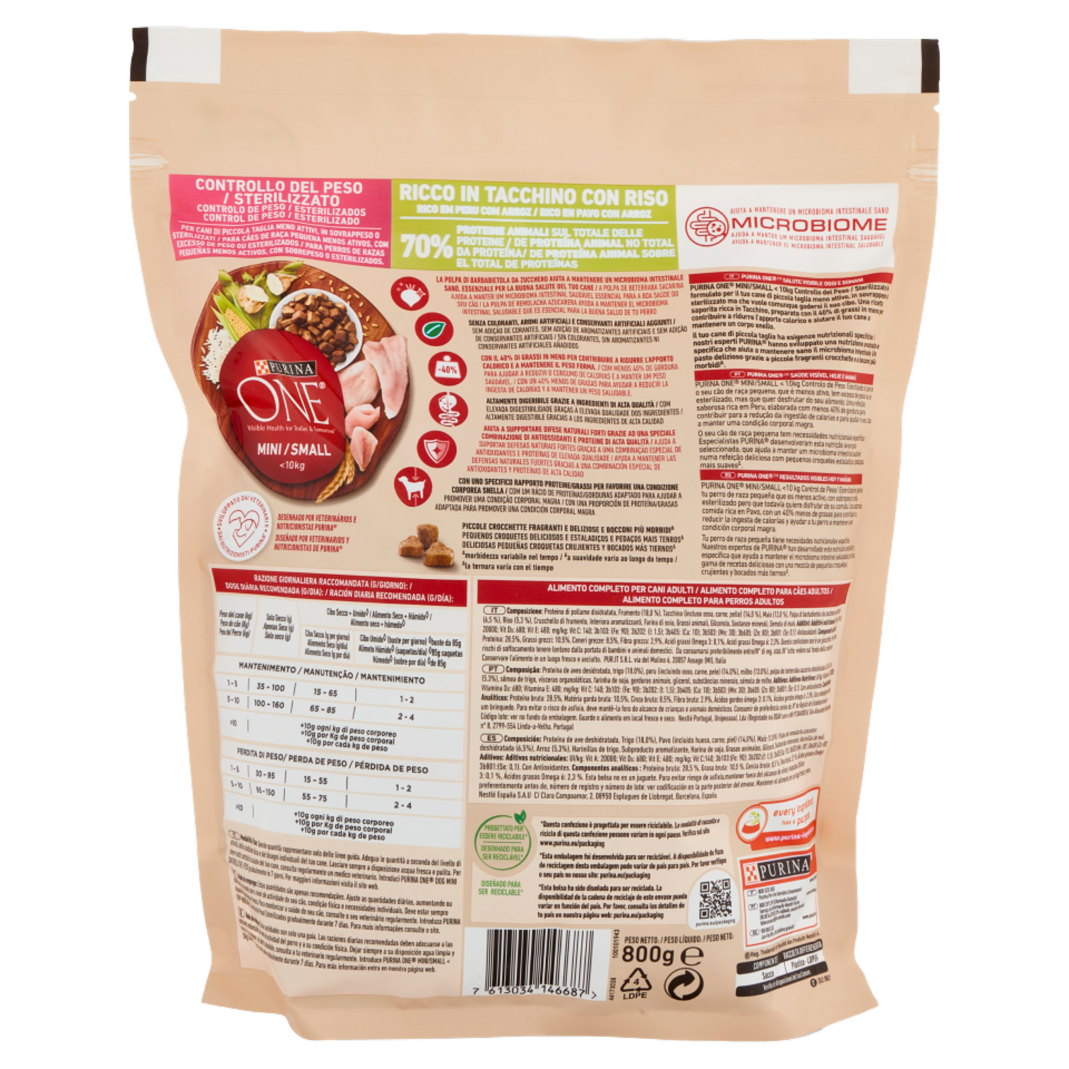 Per cani di piccola taglia meno attivi, in sovrappeso o sterilizzati. La polpa di barbabietola da zucchero aiuta a mantenere un microbioma intestinale sano, essenziale per la buona salute del tuo cane Senza coloranti, aromi artificiali e conservanti artificiali aggiunti Con il 40% di grassi in meno per contribuire a ridurre l'apporto calorico e a mantenere il peso forma. Altamente digeribile grazie a ingredienti di alta qualità Aiuta a supportare difese naturali forti grazie ad una speciale combinazione di antiossidanti e proteine di alta qualità Con uno specifico rapporto proteine/grassi per favorire una condizione corporea snella Sviluppato dai veterinari e dai nutrizionisti PURINA Piccole crocchette fragranti e deliziose e bocconi più morbidi° PURINA ONE⁽ ⁾Salute visibile oggi e domani PURINA ONE Mini/Small < 10kg Controllo del Peso / Sterilizzato è formulato per il tuo cane di piccola taglia meno attivo, in sovrappeso o sterilizzato ma che vuole comunque godersi il suo cibo. Una ricetta saporita ricca in Tacchino, preparata con il 40% di grassi in meno per contribuire a ridurre l'apporto calorico e aiutare il tuo cane a mantenere un corpo snello. Il tuo cane di piccola taglia ha esigenze nutrizionali specifiche. I nostri esperti PURINA hanno sviluppato una nutrizione avanzata e specifica che aiuta a mantenere sano il microbioma intestinale. Un pasto delizioso grazie a piccole fragranti crocchette e a bocconi più morbidi°. Progettato per essere riciclabile* *Questa confezione è progettata per essere riciclabile. Le modalità di raccolta e riciclo di questa confezione possono variare in ogni paese. Verifica sul sito www.purina.eu/packaging °morbidezza variabile nel tempo - Apertura salvafreschezza / Apertura facilitata - Progettato per essere riciclabile* - <10kg - Sviluppato dai veterinari e dai nutrizionisti PURINA - 40% di grassi in meno - Altamente digeribile - 70% Proteine animali sul totale delle proteine - Aiuta a mantenere un microbioma intestinale sano - *Questa confezione è progettata per essere riciclabile. Le modalità di raccolta e riciclo di questa confezione possono variare in ogni paese. Verifica sul sito www.purina.eu/packaging
