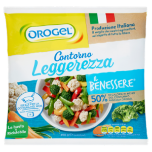 Tante gustose verdure, naturalmente ricche di sostanze nutritive e protettive, pronte in pochi minuti per un ricco contorno, ma ideali anche come base per sfiziose ricette. Il Contorno Leggerezza contiene meno carboidrati e quindi fornisce oltre il 50% di calorie in meno del Contorno Fantasia Orogel. Il Benessere Ricco di fibre e vitamina A, un aiuto per mantenere in buona salute la pelle e la vista e per il buon funzionamento del sistema immunitario. Orogel con te! Per il tuo Benessere. Almeno 5 porzioni di verdura e frutta ogni giorno e un'alimentazione equilibrata, forniscono al tuo organismo tanti principi nutritivi e protettivi tipici dei vegetali. Insieme ad una vita sana e attiva, sono fondamentali per un buono stato di salute. Orogel è alla costante ricerca delle scelte più sostenibili Questa busta è già di dimensioni e spessore ridotti al minimo Questo materiale conserva al meglio il prodotto al suo interno Busta Riciclabile Facile da smaltire nella raccolta della plastica Il suo riciclo darà vita a nuovi oggetti