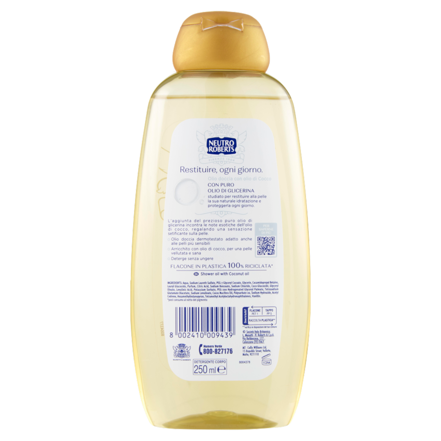 Gentile con la pelle Formulato per detergere anche le pelli più sensibili. Arricchito con olio naturale di cocco, setificante e illuminante che aiuta la pelle a proteggersi dalla secchezza cutanea. La sua formula leggera e delicatamente profumata non unge e rende la detersione quotidiana un vero momento di piacere. Gentile con il pianeta - * flacone in plastica 100% riciclata post consumo al netto del pigmento. - flacone riciclabile da smaltire nella raccolta differenziata della plastica. Deterge senza ungere