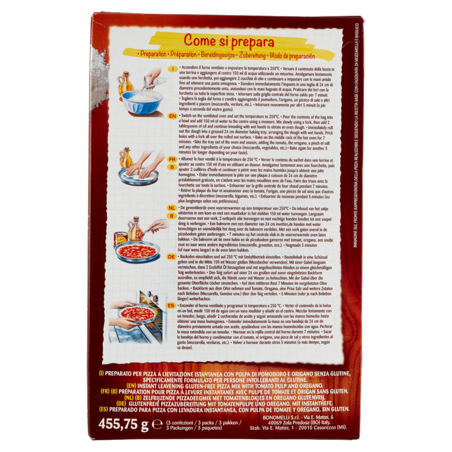 Preparato per pizza a lievitazione istantanea con polpa di pomodoro e origano senza glutine, specificamente formulato per persone intolleranti al glutine