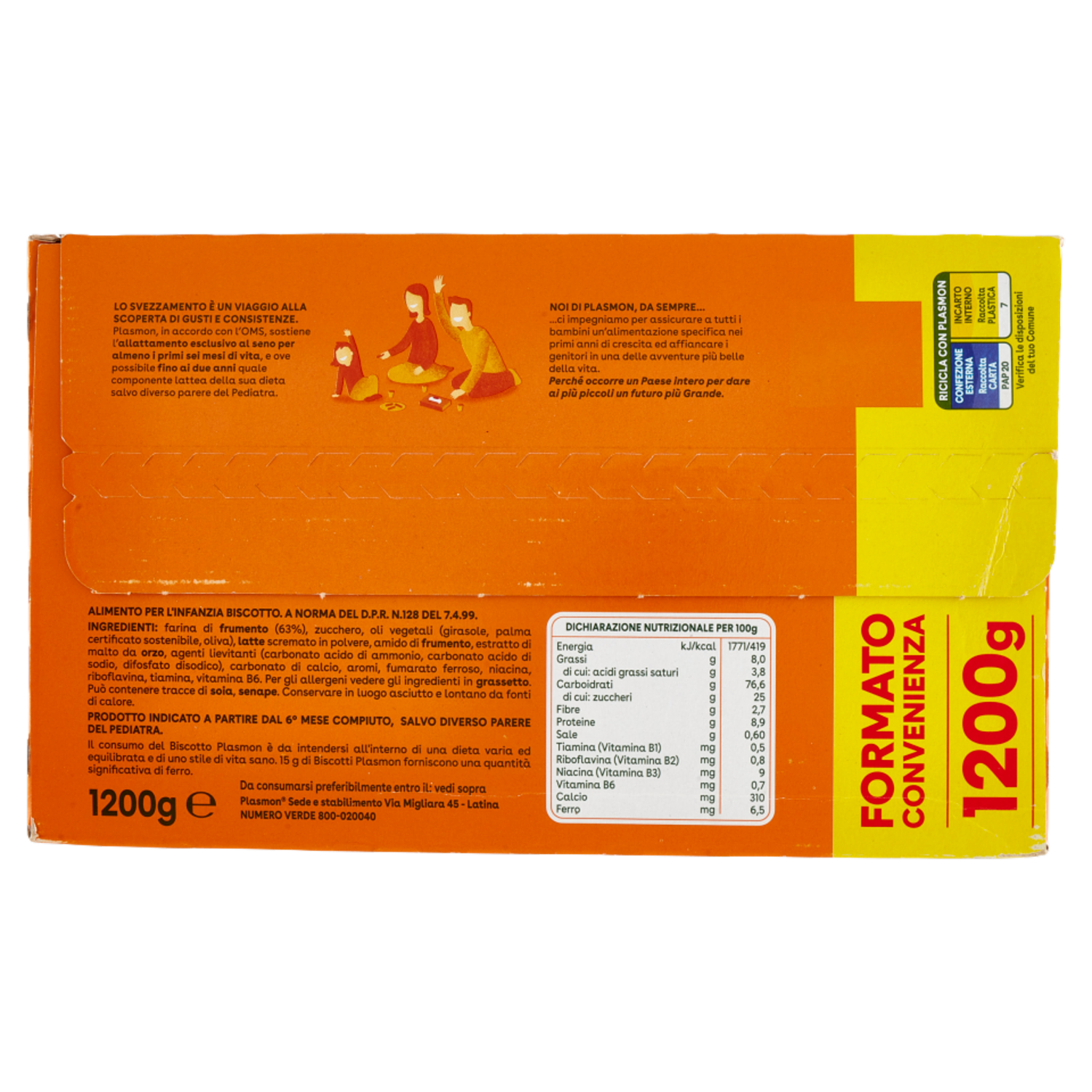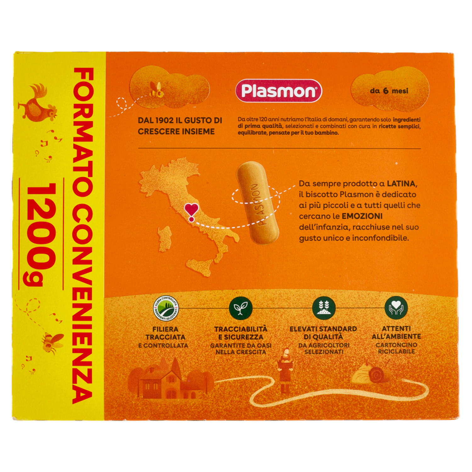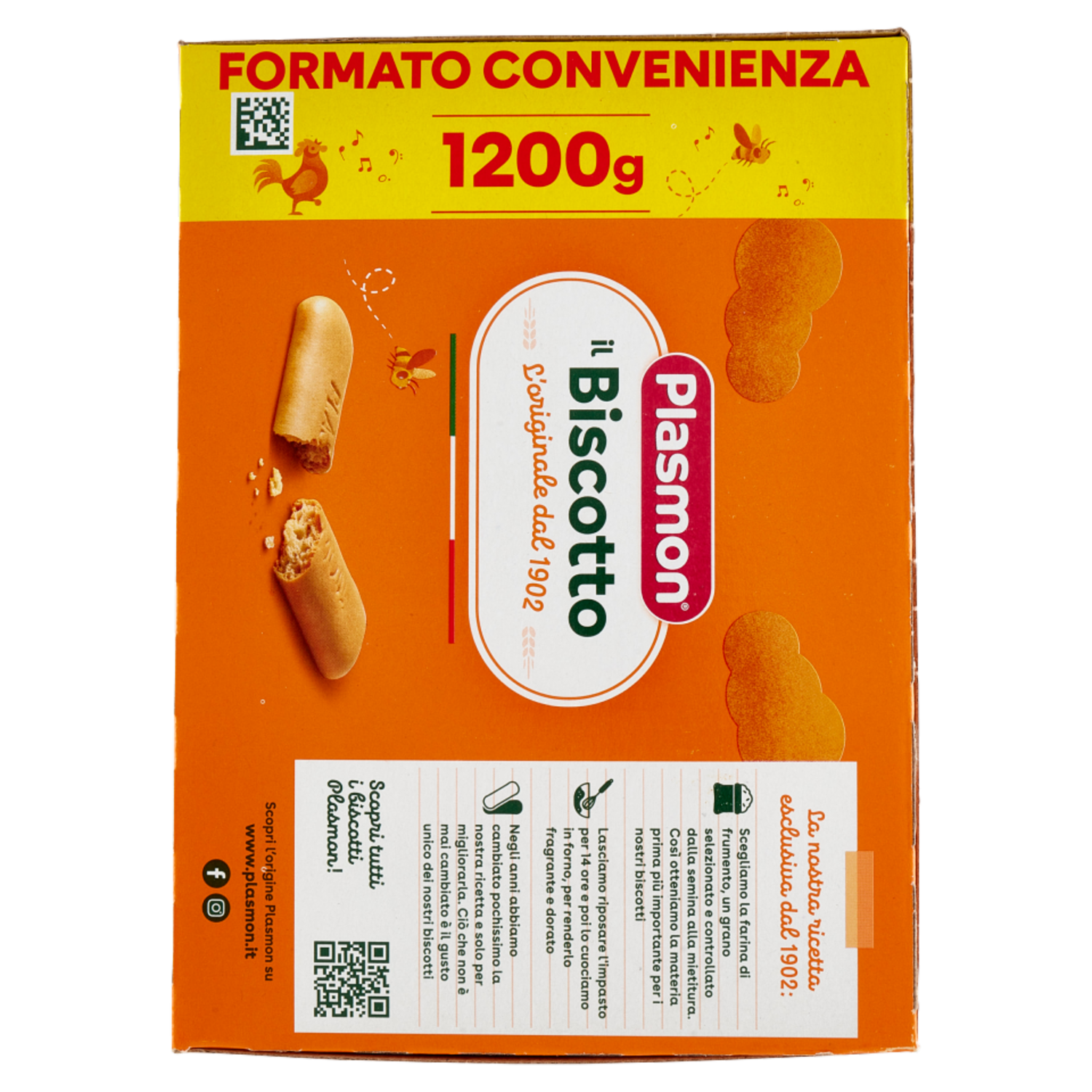 Da sempre prodotto a Latina, il biscotto Plasmon è dedicato ai più piccoli e a tutti quelli che cercano le Emozioni dell'infanzia La nostra ricetta esclusiva dal 1902: Scegliamo la farina di frumento, un grano selezionato e controllato dalla semina alla mietitura. Così otteniamo la materia prima più importante per i nostri biscotti Lasciamo riposare l'impasto per 14 ore e poi lo cuociamo in forno, per renderlo fragrante e dorato Negli anni abbiamo cambiato pochissimo la nostra ricetta e solo per migliorarla. Ciò che non è mai cambiato è il gusto unico dei nostri biscotti Scopri tutti i biscotti Plasmon! Il consumo del biscotto Plasmon è da intendersi all'interno di una dieta varia ed equilibrata e di uno stile di vita sano. 15 g di biscotti Plasmon forniscono una quantità significativa di ferro.
