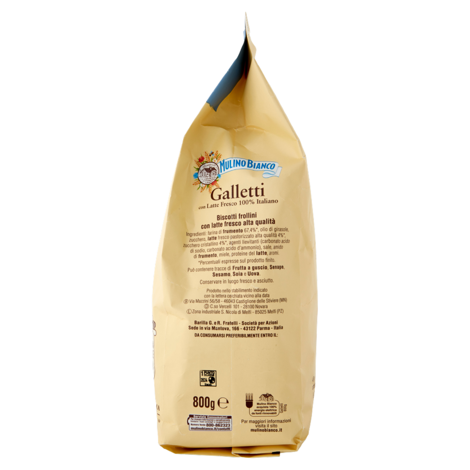 Farina, latte e zucchero. Tre semplici ingredienti alla base di uno dei biscotti più buoni della tradizione Mulino Bianco da oggi con ancora più latte fresco 100% italiano. zucchero - farina - Latte 100% italiano Ancora più Galletti! Con farina da agricoltura sostenibile Ogni Galletto di questa confezione è fatto con Farina di frumento da Agricoltura Sostenibile rispettando le 10 regole della Carta del Mulino. Il buono che non vedi - Questa confezione mantiene intatta la fragranza ed è interamente riciclabile nella carta. - Tutti i nostri biscotti sono senza grassi idrogenati e senza coloranti. Sono inoltre preparati senza l'utilizzo di conservanti. Si raccomanda di tenerli in un luogo fresco e asciutto.