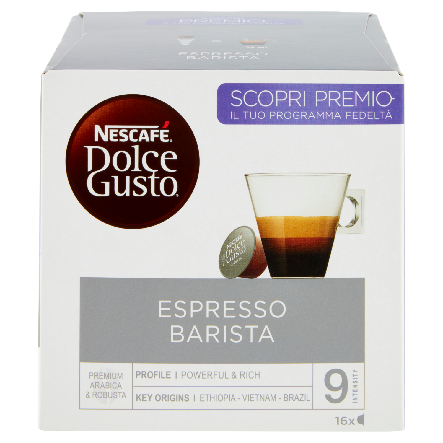 Una speciale selezione realizzata dai nostri coffee creators per un espresso intenso dallo stile unico. Delicato Arabica del Brasile - Fruttato Arabica dell'Etiopia - Corposo Robusta del Vietnam Grown respectfully Caffè coltivato con rispetto Per sapere di più: dolce-gusto.com Scopri il nostro espresso barista, creazione originale dei nostri coffee creators. Assapora l'incredibile abilità dei nostri baristi nel combinare forza e stile in un espresso corto e cremoso. Questo espresso rivela una piacevole acidità, con note delicate di agrumi ed è ricoperto da una generosa crema densa e dorata. - Premium arabica & robusta - Profile | Powerful & rich - Key origins | Ethiopia - Vietnam - Brazil - Intensity 9 - 16x Capsule