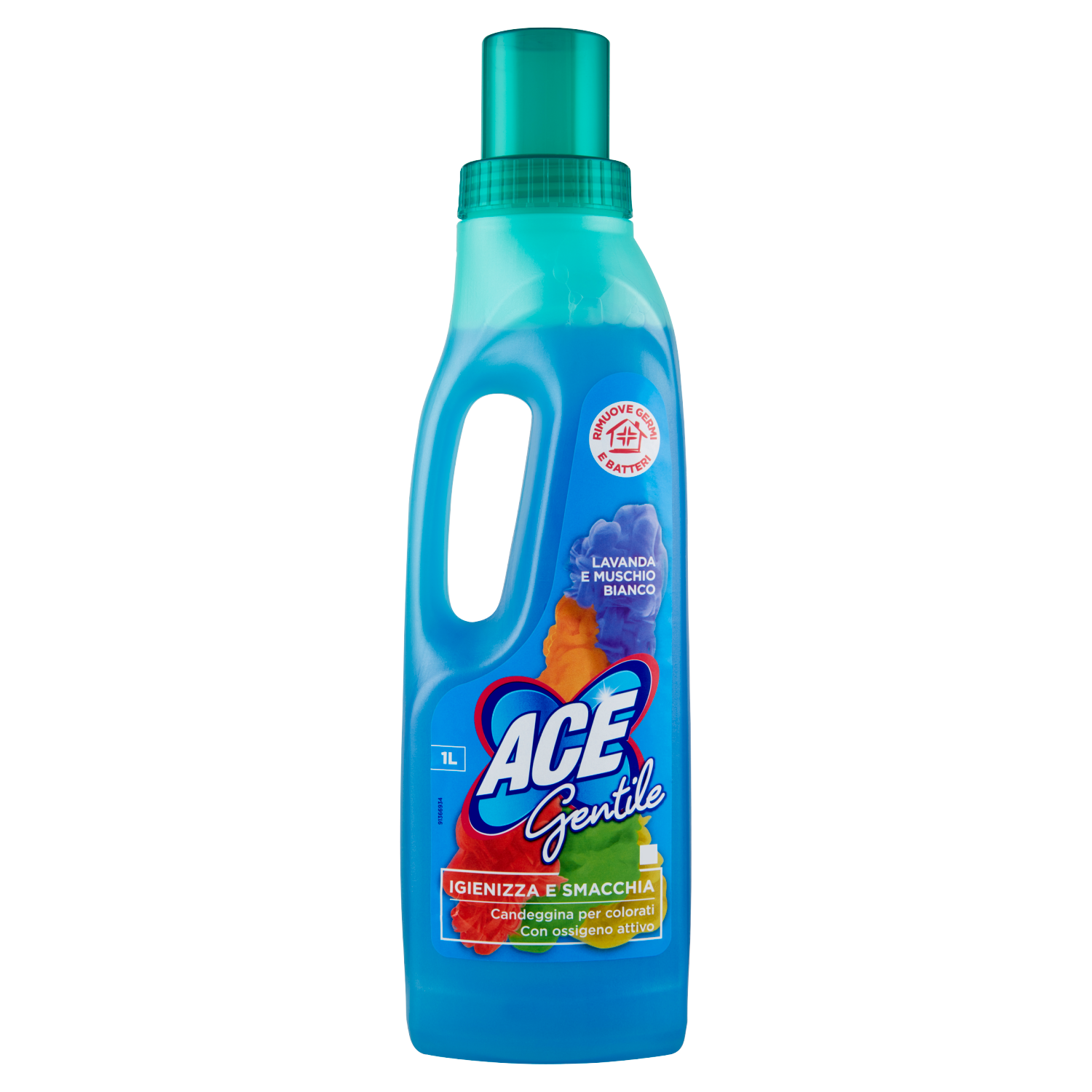 Ace Gentile è la candeggina studiata per colorati, sicura per i colori e i tessuti. Ace Gentile: - Igienizza i capi colorati rimuovendo germi e batteri* - È efficace su tutti i tipi di macchie: grasse (come il grasso di carne), ossidabili (come il vino), enzimatiche (come l'erba), contenenti particolato (come il trucco). *Non è un prodotto disinfettante