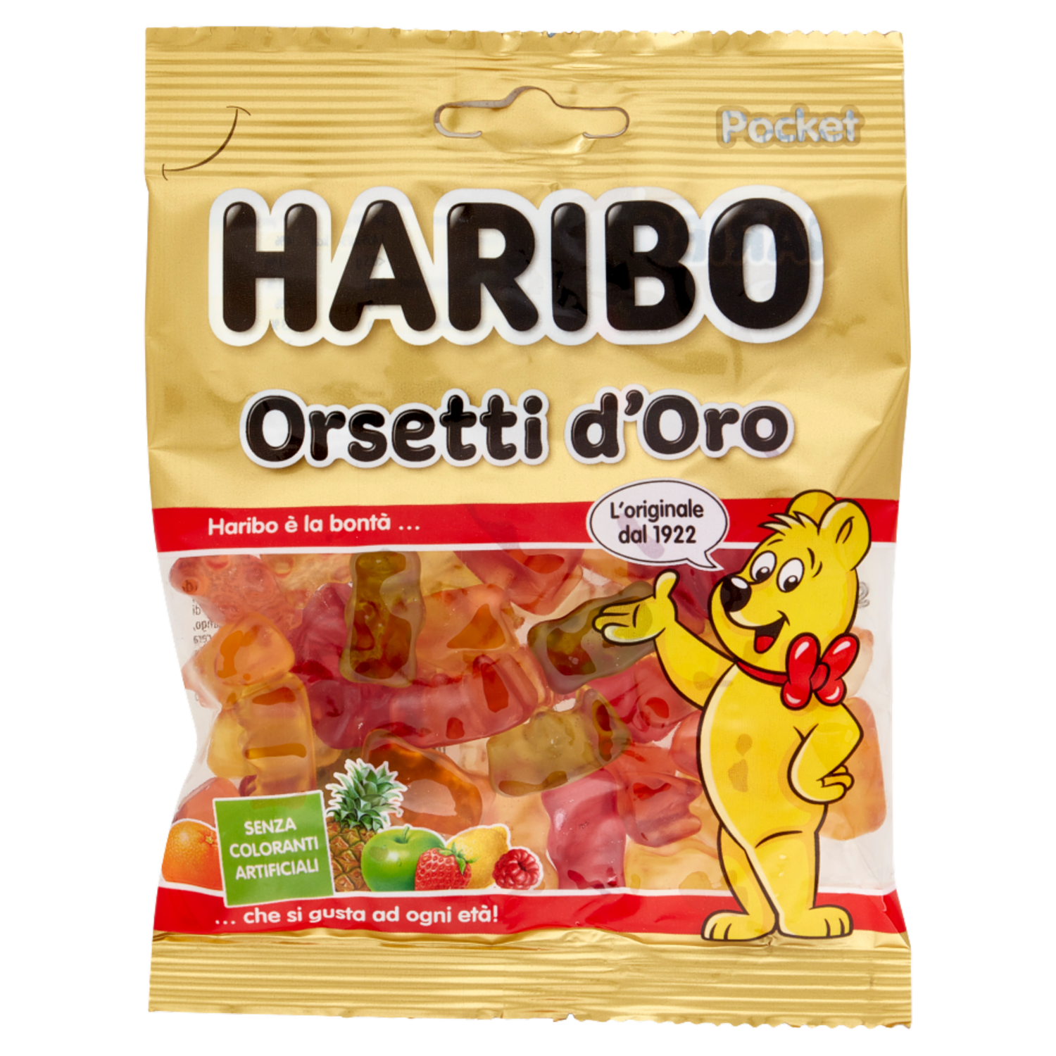 Cari Fans Haribo, Ingredienti accuratamente selezionati e una ricetta che viene costantemente migliorata da più di 90 anni fanno degli Orsetti D'Oro un piacere unico. In tutto il mondo gli Orsetti D'Oro, così come gli altri prodotti Haribo, sono apprezzati da generazioni. Adulti e bambini si fidano del marchio Haribo e amano gli Orsetti D'Oro. Siamo legati a questa missione e alla tradizione dei Creatori degli Orsetti D'Oro - Dr. Hans Riegel e Paul Riegel - poichè la nostra filosofia è "Haribo è la bontà che si gusta ad ogni età". Il vostro Team Haribo Fragola, Arancia, Mela, Lampone, Limone, Ananas