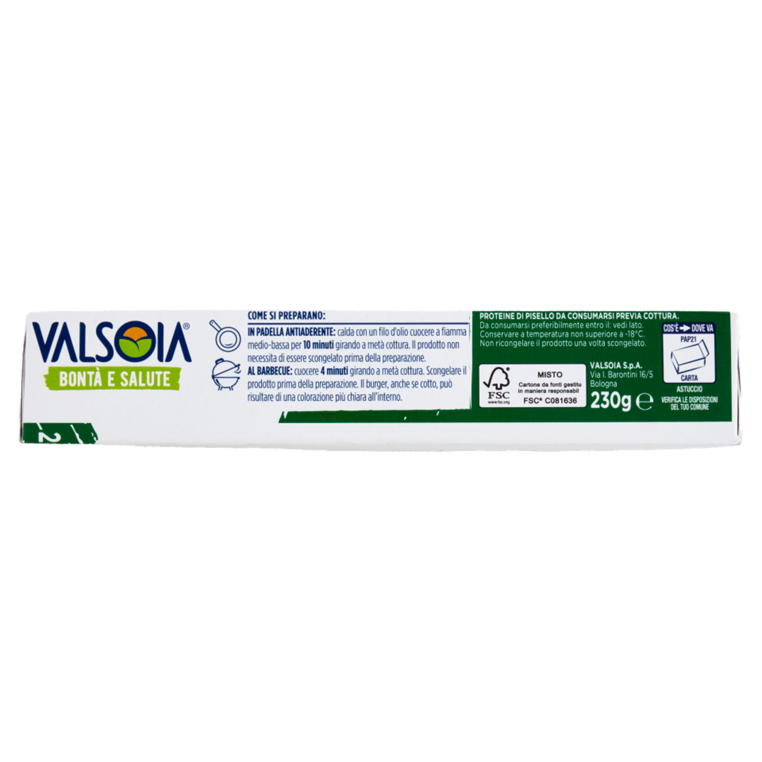 Il burger gusto barbecue Valsoia ti sorprenderà grazie al suo gusto deciso. Condividilo con i tuoi amici per un panino gustoso, rispettando il pianeta. Nell'ambito di una dieta varia ed equilibrata e di uno stile di vita sano, le proteine contribuiscono al mantenimento della massa muscolare. Una porzione pari ad un Burger (115g) contiene 18,4g di proteine, pari a circa il 37% della quantità giornaliera di proteine consigliata per ottenere l'effetto benefico (50g). Questa confezione contiene 2 porzioni.
