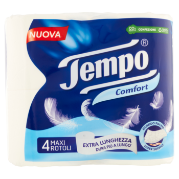 FSC - Fibre rinnovabili di origine naturale, derivanti dalla gestione forestale responsabile. CO₂ Ridotta - Lavoriamo per ridurre le emissioni di Co2 dei nostri prodotti. Per saperne di più consulta il nostro sito www.tempo-world.com 100% confezione riciclabile: realizzata con almeno il 30% di plastica riciclata. CO₂ Ridotta - Confezione 100% riciclabile* La nostra confezione è riciclabile e composta da almeno il 30% di plastica riciclata, per una minore quantità di rifiuti di plastica. Riduzione emissioni di CO₂ delle confezioni, grazie all'utilizzo di plastica riciclata, basato sulla Valutazione del Ciclo di Vita condotto da Essity e verificato da un ente terzo. *Confezione riciclabile riciclabilità valutata secondo norma ISO 18604, per scopi diversi. Il riciclaggio dipende da diversi fattori ad es. la presenza di sistema di riciclaggio a livello locale. Maggiori informazioni sono disponibili su tempo-world.com Dermatologicamente Testato 4 maxi rotoli *durano il doppio dei normali rotoli