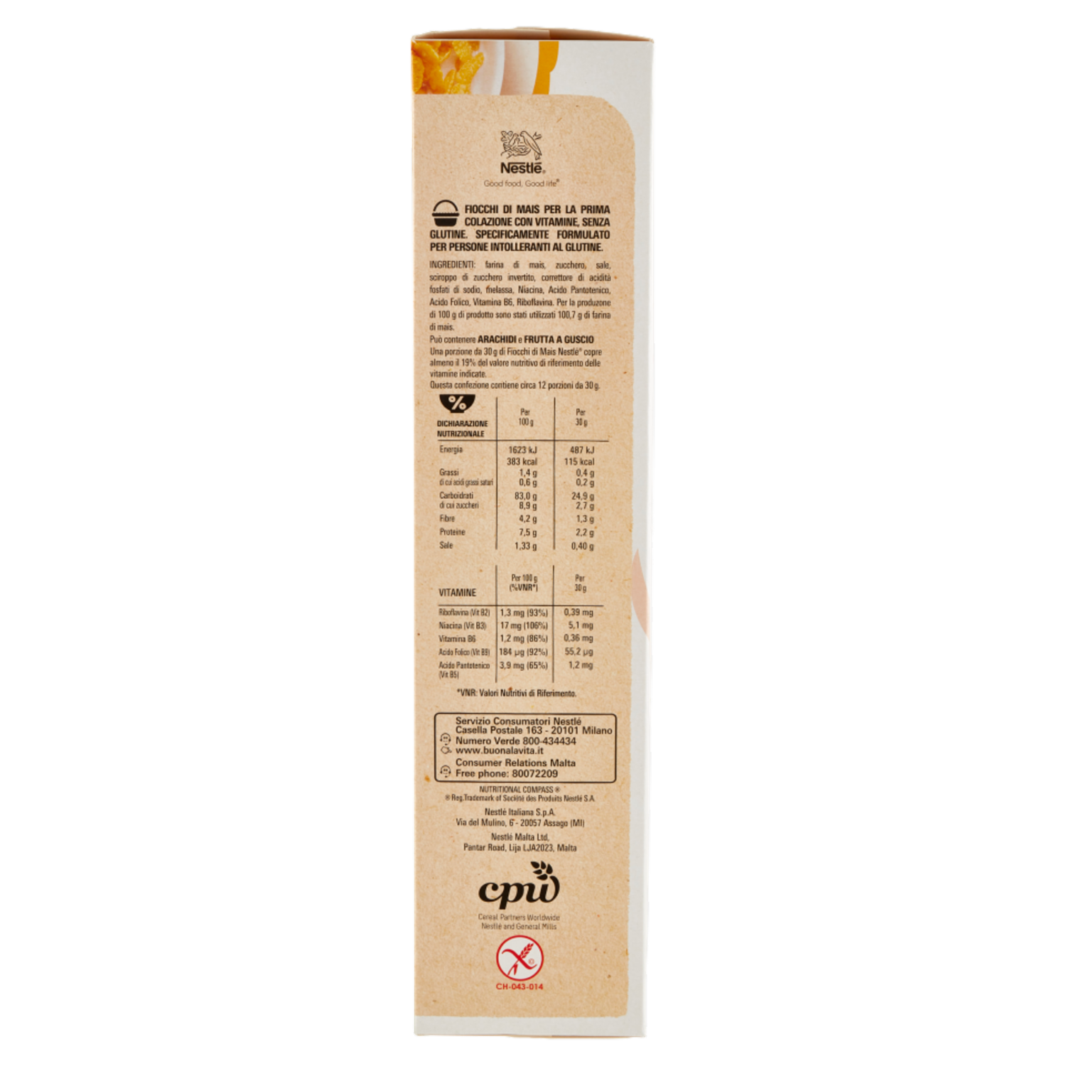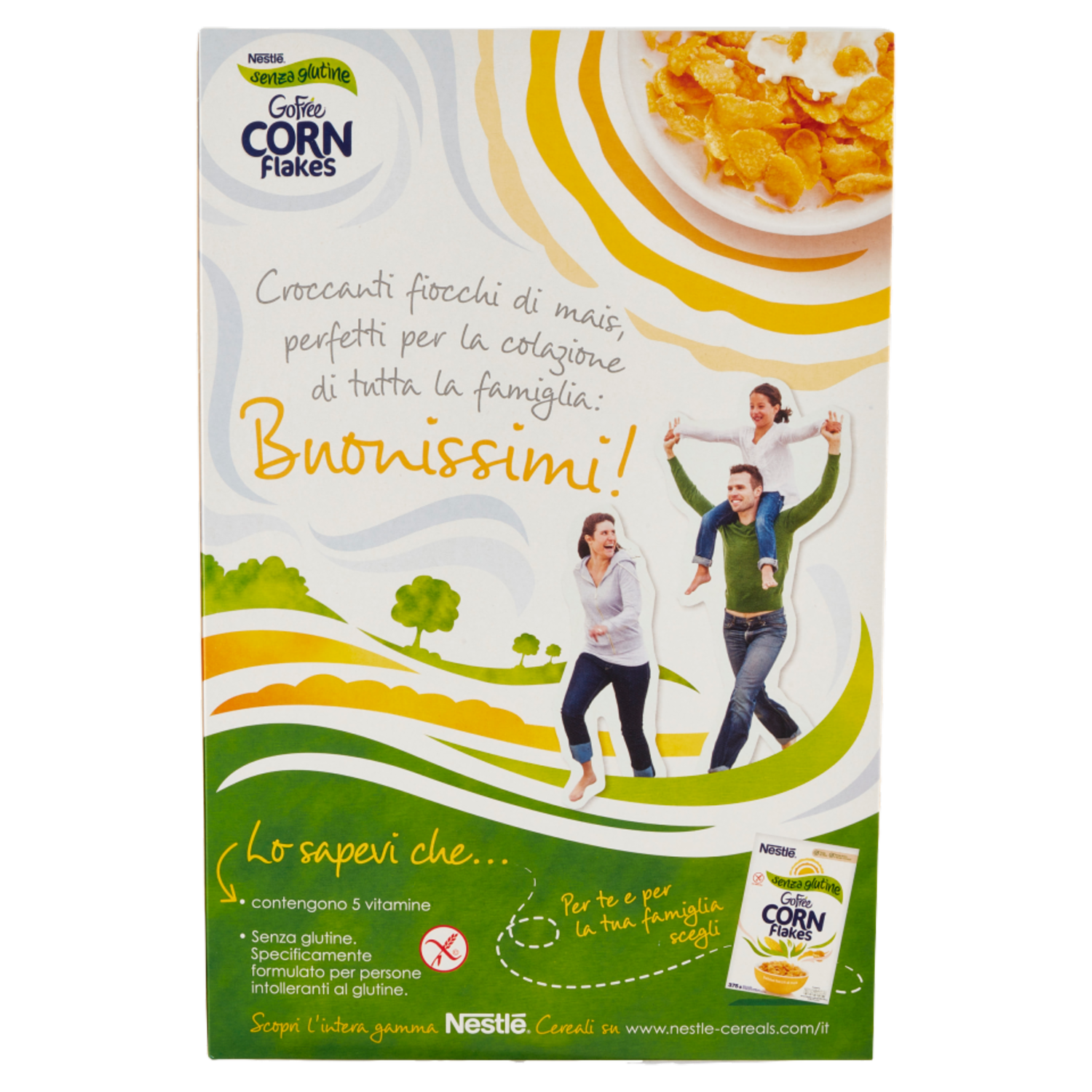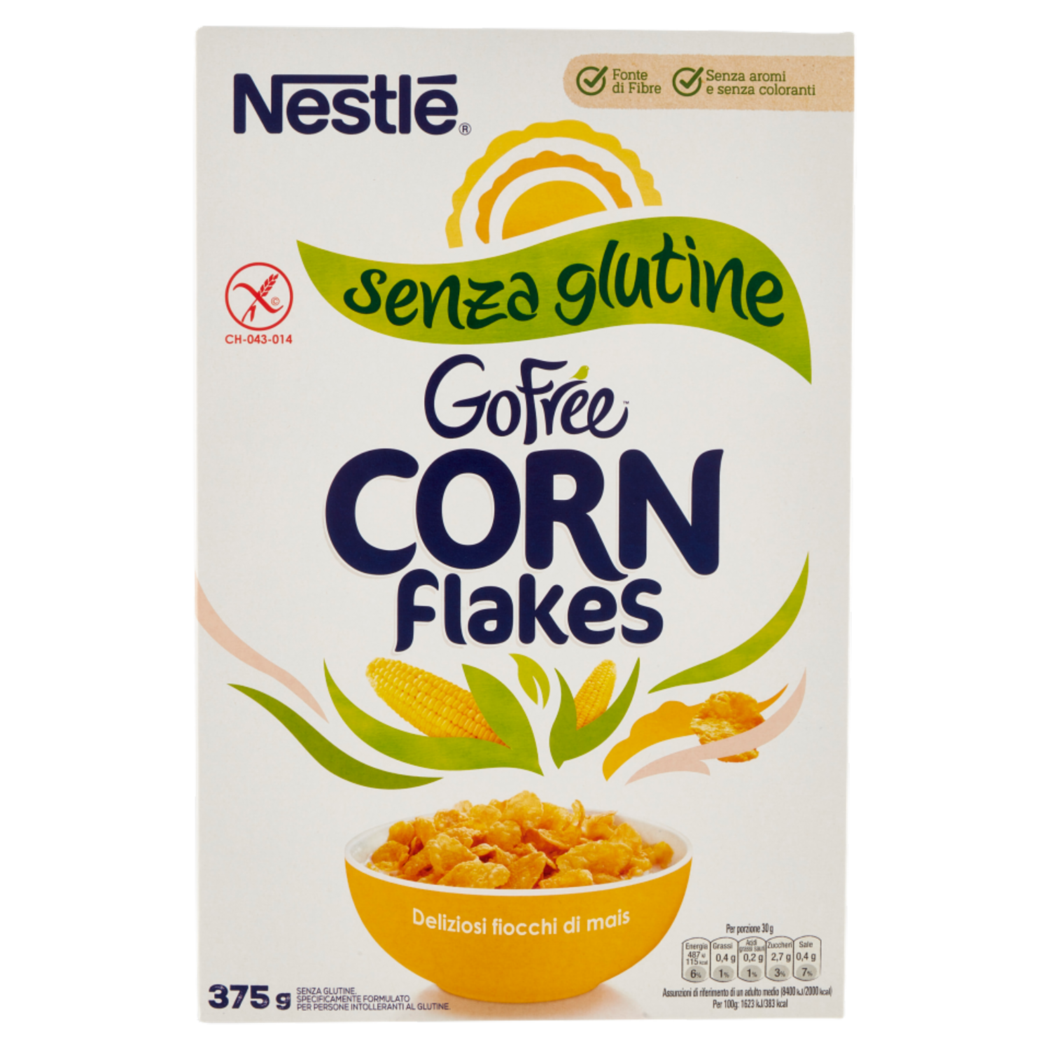 Croccanti fiocchi di mais, perfetti per la colazione di tutta la famiglia: Buonissimi! Lo sapevi che... - contengono 5 vitamine - Senza glutine. Specificamente formulato per persone intolleranti al glutine. Scopri l'intera gamma NESTLÉ Cereali su www.nestle-cereals.com/it - Fonte di Fibre - Senza aromi e senza coloranti - Senza glutine - Deliziosi fiocchi di mais - Senza glutine. Specificamente formulato per persone intolleranti al glutine