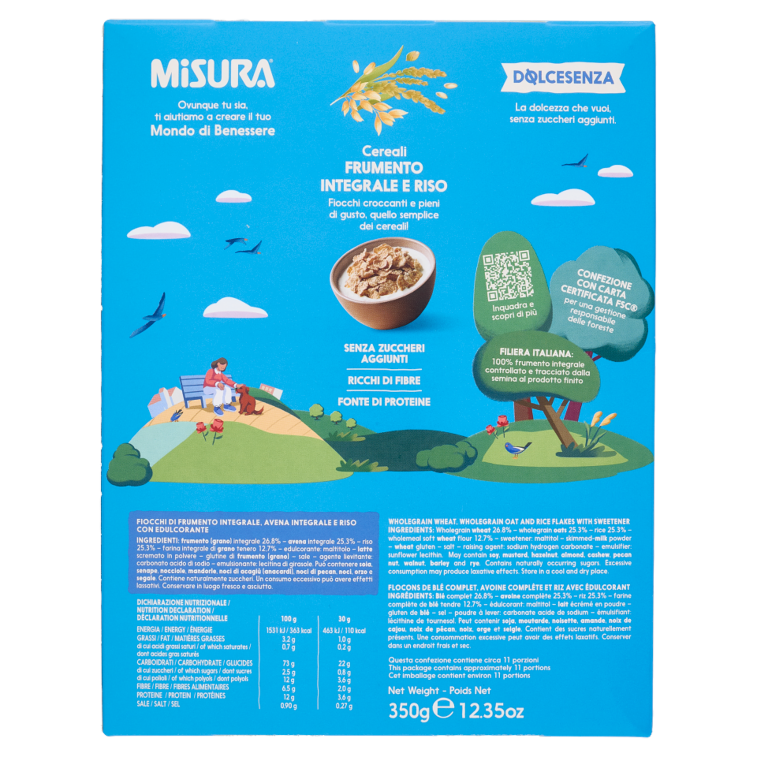 A Misura d'ambiente Filiera 100% italiana Il nostro frumento integrale è 100% italiano ed è sottoposto a rigorosi controlli. Tutto il processo produttivo è Tracciabile, dal luogo di coltivazione al prodotto finito. confezione con Carta Certificata FSC Cosa Vuol Dire? La carta scelta per questo prodotto è Carta certificata FSC per una gestione responsabile delle foreste e degli ecosistemi. Contribuisci anche tu alla cura dell'ambiente. Scopri di più su www.misura.it. Nessun Segreto, il buono è tutto qui! Ricchi in fibre Fonte di proteine Senza aromi Senza additivi conservanti e coloranti Gli zuccheri presenti nel prodotto sono unicamente quelli che derivano dalle materie prime: in una porzione di 30g di prodotto meno di 1/4 di cucchiaino da thè! Semplicemente Dolcesenza Tutta la dolcezza delle Materie Prime senza zuccheri aggiunti si uniscono in fiocchi croccanti e pieni di gusto! Ricette buone, semplici e trasparenti