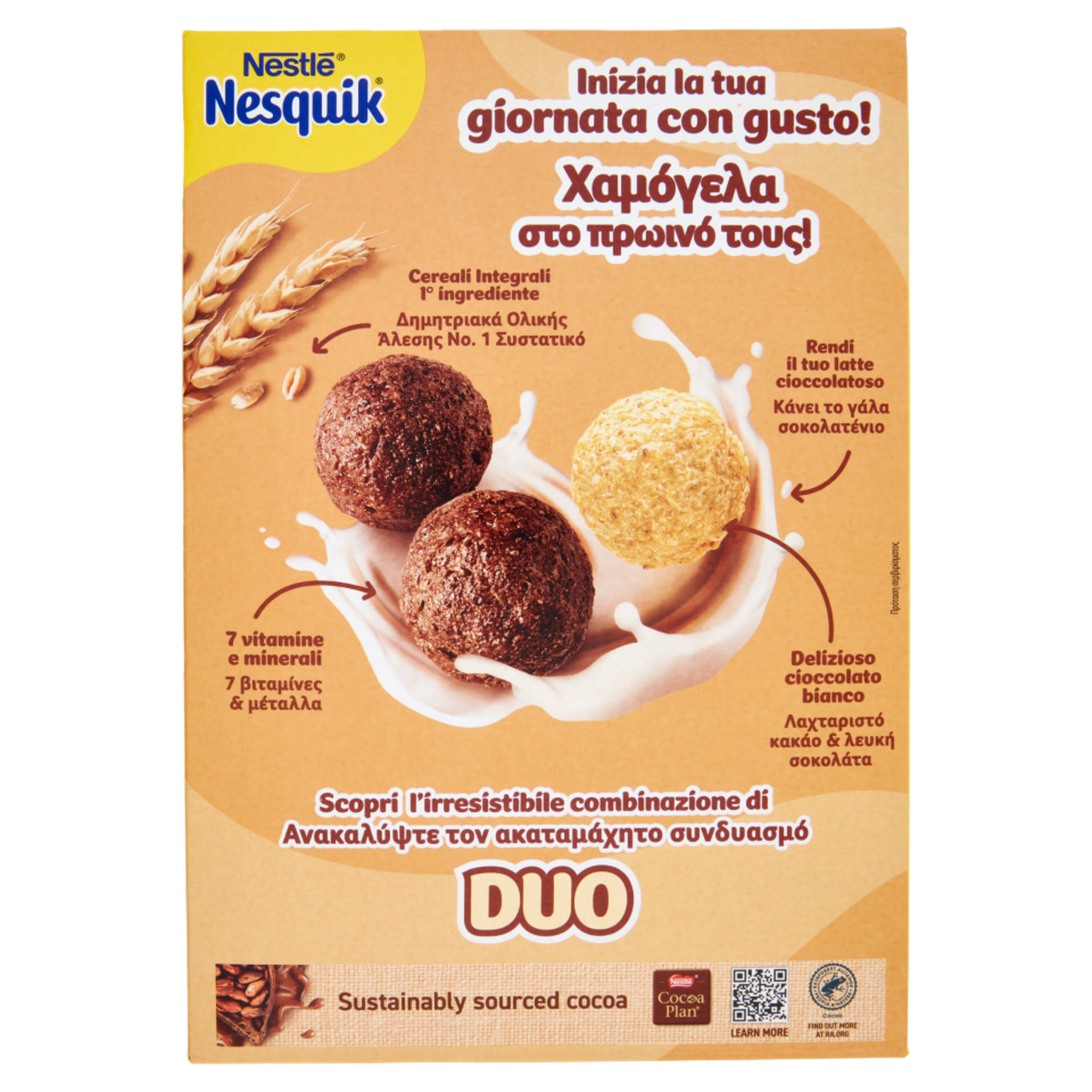 Inizia la tua giornata con gusto! Cereali Integrali 1° ingrediente Rendi il tuo latte cioccolatoso Delizioso cioccolato bianco 7 vitamine e minerale Scopri l'irresistibile combinazione di Duo Nutre le tue idee - Il Ferro contribuisce alla normale funzione cognitiva e anche al normale sviluppo cognitivo dei bambini. Le Vitamine B6 e B3 (Niacina) contribuiscono alle normali funzioni psicologiche. L'Acido Pantotenico (B5) contribuisce a prestazioni mentali normali. Consuma i Cereali NESQUIK come parte di una dieta varia ed equilibrata e di uno stile di vita sano. Provali tutti ...scopri gli altri gusti NESQUIK - Cereali Integrali - Ingrediente n° 1 - Mix unico e irresistibile