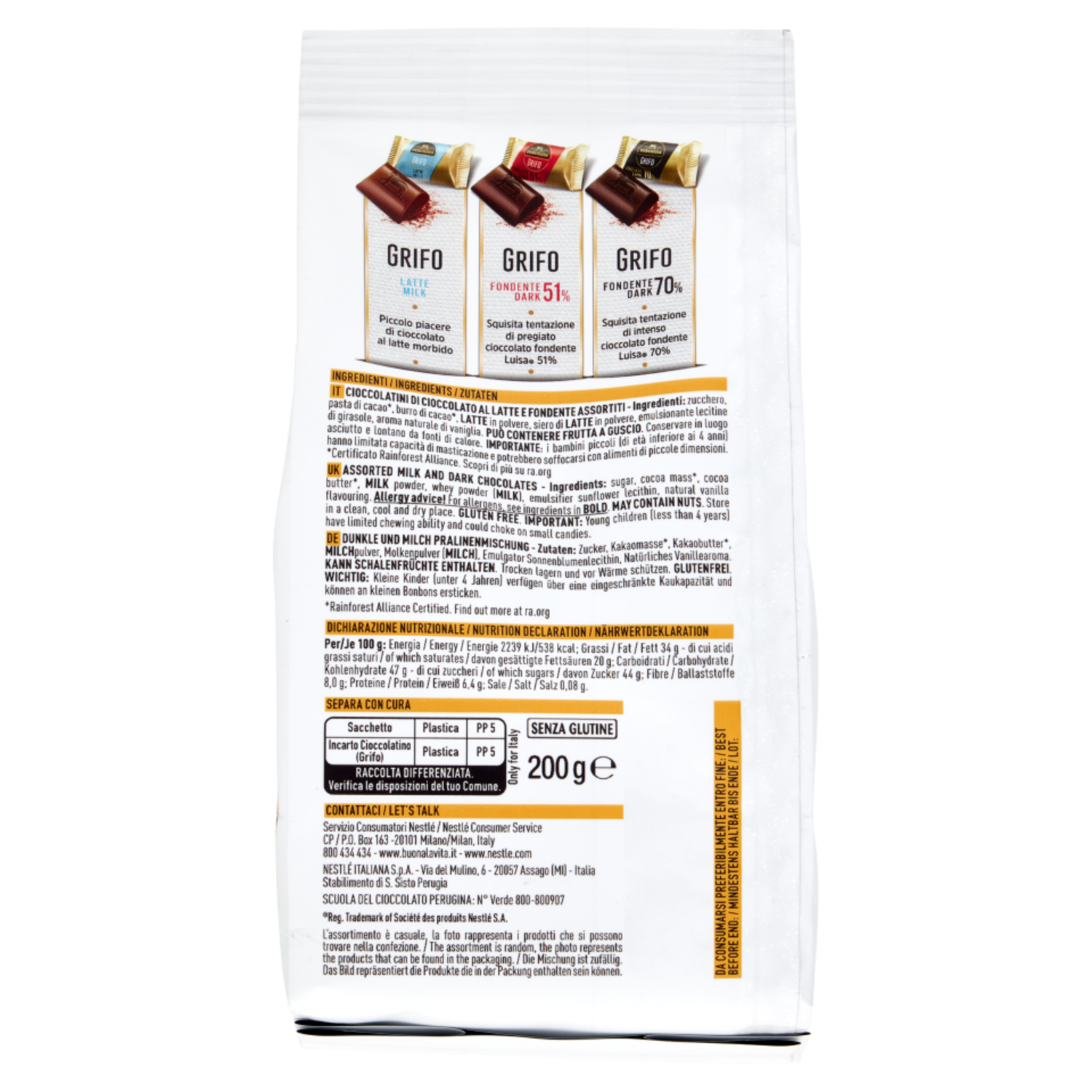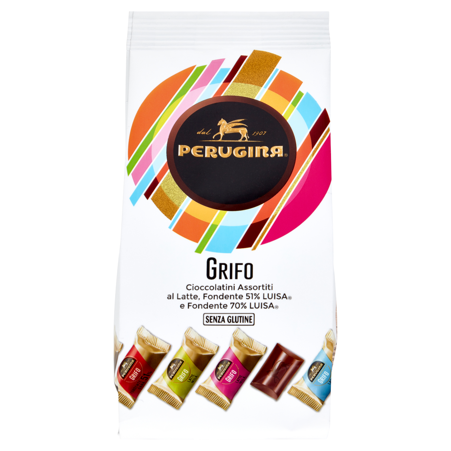 Grifo latte Piccolo piacere di cioccolato al latte morbido Grifo fondente 51% Squisita tentazione di pregiato cioccolato fondente LUISA 51% Grifo fondente 70% Squisita tentazione di intenso cioccolato fondente LUISA 70% Senza glutine - Cioccolatini Assortiti al Latte, Fondente 51% LUISA e Fondente 70% LUISA - Senza glutine