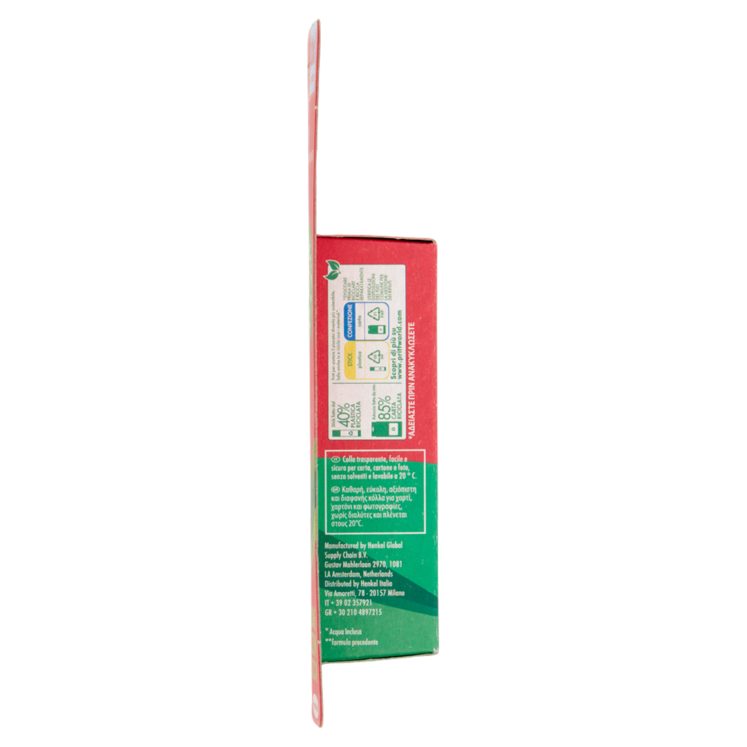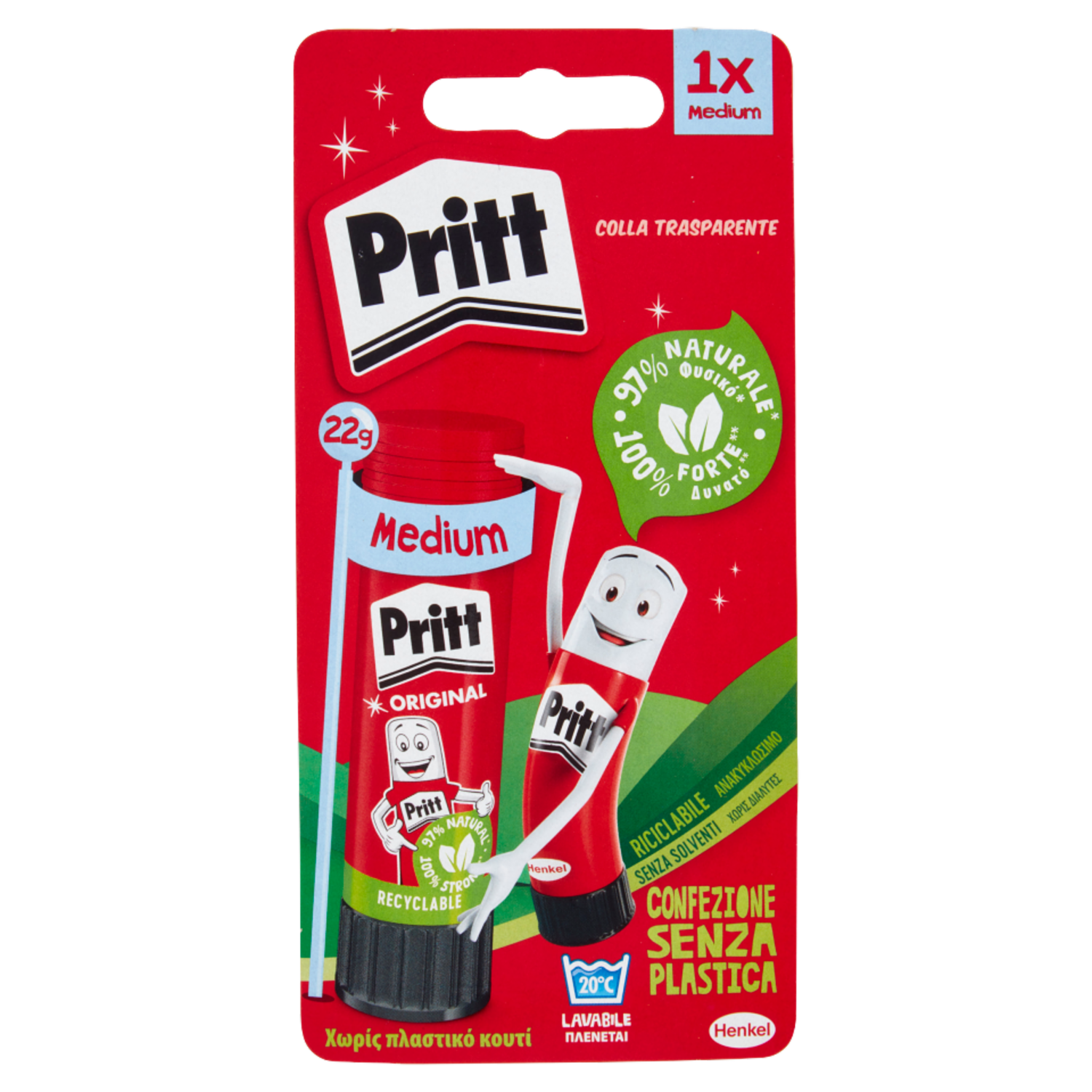 97% di ingredienti naturali!* Formula sicura a base di amido di patate, zucchero e acqua. 100% forte!** Formula per un forte incollaggio prodotta in Germania dal 1969. Adesione durata e senza increspature. Confezione senza plastica! Per proteggere il nostro pianeta, Pritt ha rimosso la plastica dalla scatola! * Acqua Inclusa **formula precedente Colla trasparente, facile e sicura per carta, cartone e foto, senza solventi e lavabile a 20 °C.