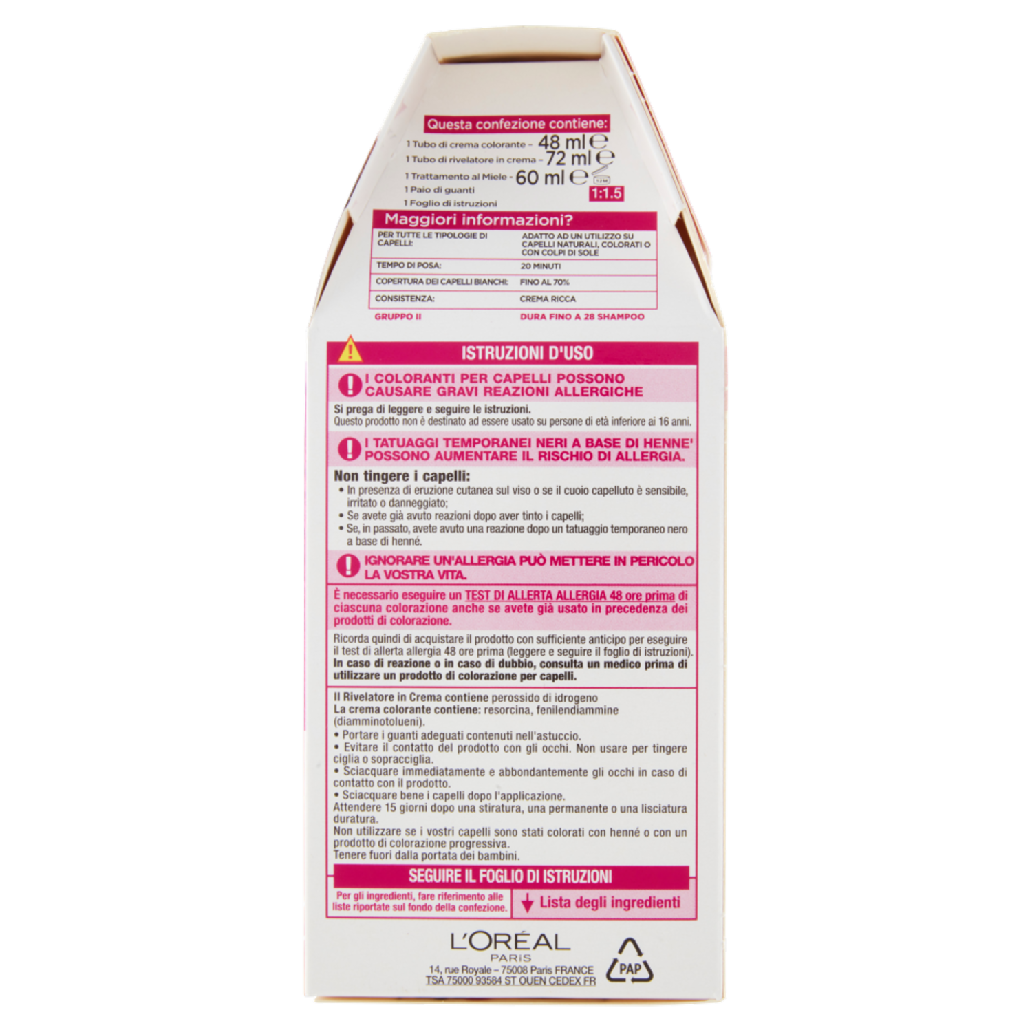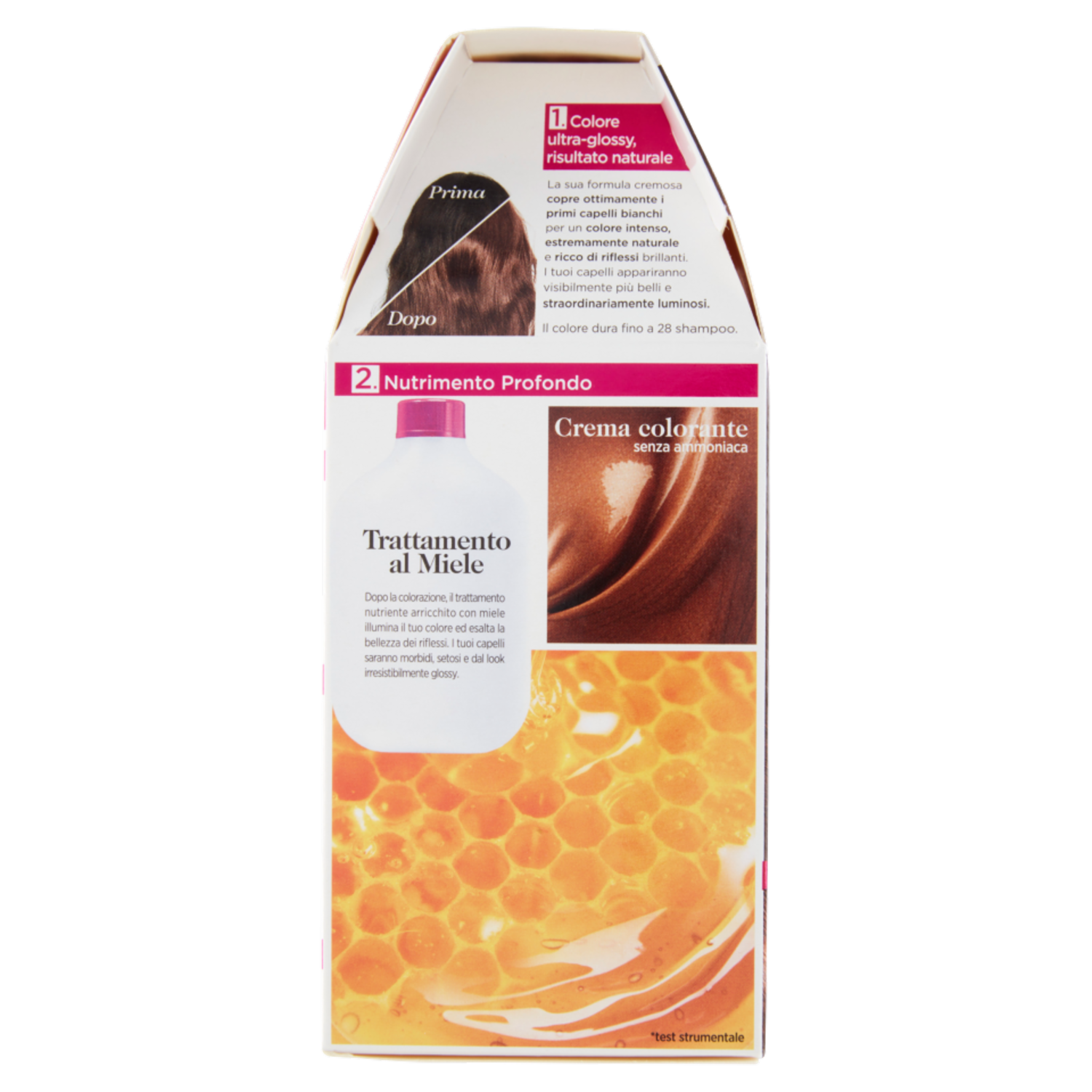 1. Colore ultra-glossy, risultato naturale La sua formula cremosa copre ottimamente i primi capelli bianchi per un colore intenso, estremamente naturale e ricco di riflessi brillanti. I tuoi capelli appariranno visibilmente più belli e straordinariamente luminosi. Il colore dura fino a 28 shampoo. 2. Nutrimento Profondo Crema colorante senza ammoniaca Trattamento al Miele Dopo la colorazione, il trattamento nutriente arricchito con miele illumina il tuo colore ed esalta la bellezza dei riflessi. I tuoi capelli saranno morbidi, setosi e dal look irresistibilmente glossy. 3. È la tua prima colorazione? La nostra colorazione è facile da utilizzare, anche se è la tua prima volta** **Leggere attentamente il foglio di istruzioni