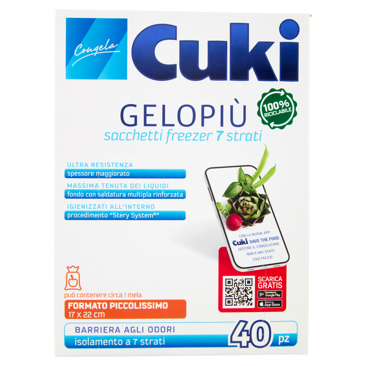 Caratteristiche Scopri i vantaggi dei Sacchetti Cuki Gelopiù! Il risultato della conservazione degli alimenti dipende anche dalla qualità del sacchetto utilizzato. Per questo motivo Cuki ha realizzato i Sacchetti Cuki Gelopiù con l'esclusiva formula in polietilene a 7 strati differenziati per offrirti: * Effetto barriera: isolamento dagli odori, protezione dal gelo. * Ultra elasticità e resistenza alle lacerazioni e perforazioni. * Extra tenuta: saldatura multipla rinforzata sul fondo. * Trasparenza e brillantezza: per riconoscere con facilità il contenuto. Per garantirti i più elevati standard di sicurezza alimentare i Sacchetti Cuki Gelopiù sono realizzati attraverso l'esclusivo processo di sterilizzazione dell'aria "Stery System". I sacchetti vengono igienizzati internamente attraverso l'utilizzo di aria filtrata e sottoposta a raggi UVC in camera di sterilizzazione. Polietilene trasparente a 7 strati differenziati - per un totale isolamento dagli odori - per una maggiore resistenza Soffietti laterali - per evitare la formazione di sacche d'aria - per migliorare la stabilità del sacchetto Etichetta prestampata - per indicare contenuto e data di conservazione Fondo con saldatura multipla rinforzata - per una migliore tenuta 40 Laccetti metallici - per richiudere con facilità i sacchetti