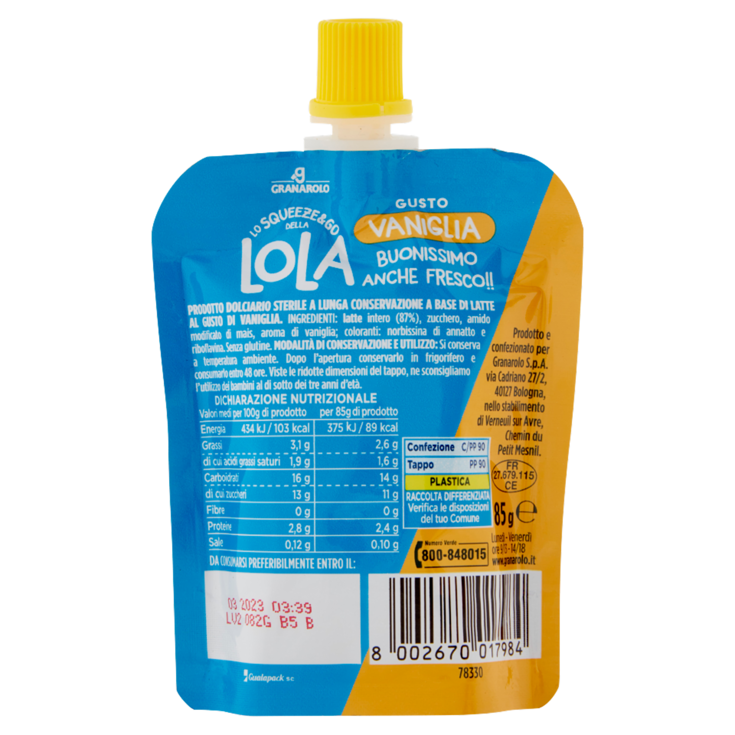 Prodotto e confezionato per Granarolo S.p.A. via Cadriano 27/2 40127 Bologna nello stabilimento di Verneuil sur Avre Chemin du Petit Mesnil