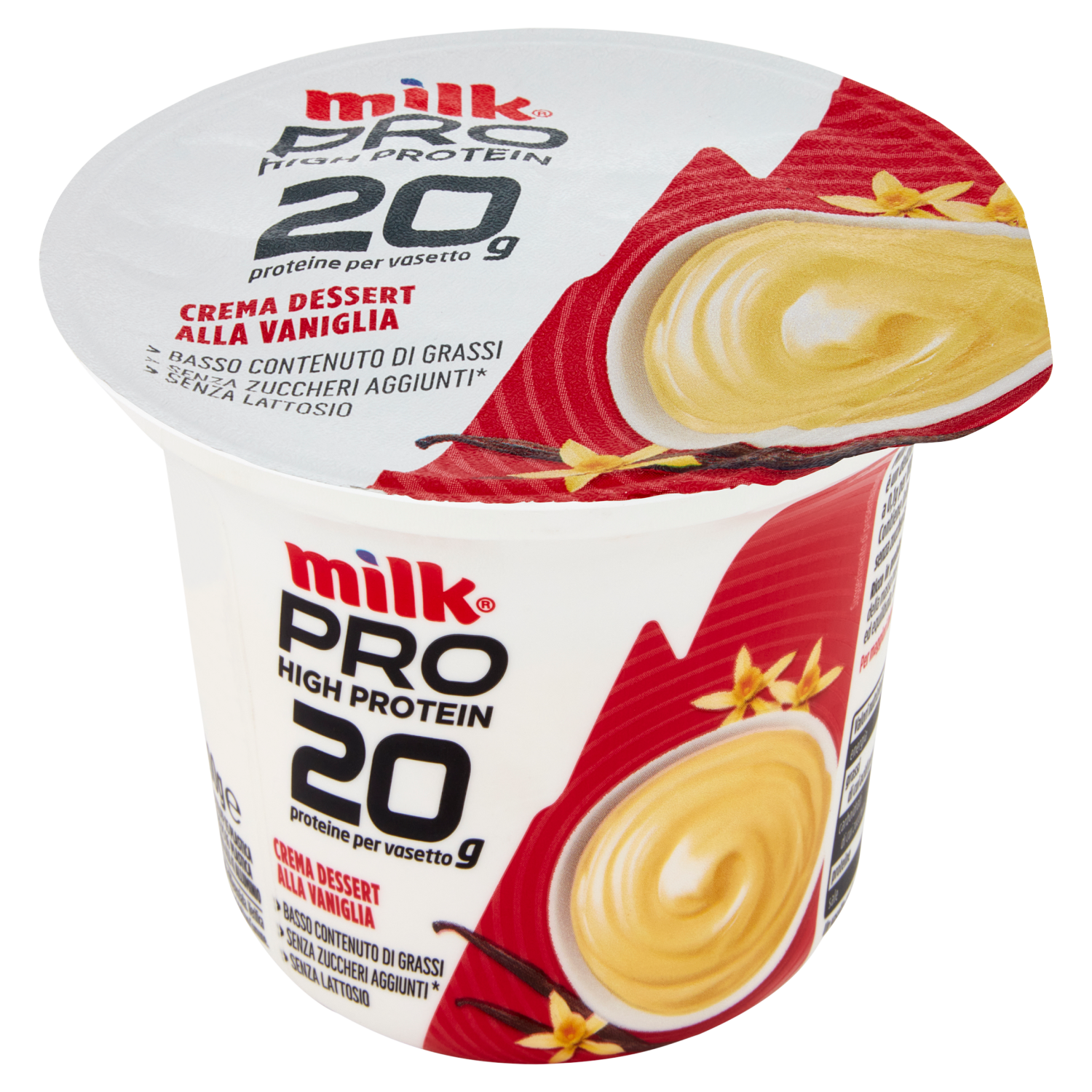 Milk Pro High Protein Crema Dessert alla vaniglia è un delizioso dessert delattosato (lattosio inferiore a 0,1g per 100g) con un elevato contenuto proteico. Contiene infatti 20g di proteine per vasetto ed è senza zuccheri aggiunti* ed a basso contenuto di grassi! *contiene naturalmente zuccheri. Ricco in proteine. Le proteine contribuiscono alla crescita della massa muscolare. È importante seguire una dieta sana ed equilibrata, ed uno stile di vita attivo.