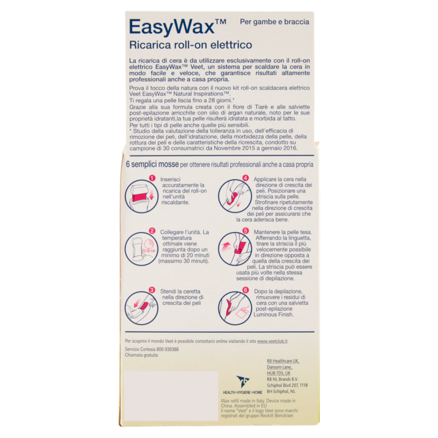 PRECAUZIONI - Conservare la confezione esterna per ulteriori precauzioni d'uso. - Studiato per l'uso su gambe, braccia, ascelle e zona bikini. - NON ADATTA all'uso su cuoio capelluto, viso, occhi, naso, orecchie, zone perianali e genitali, capezzoli o su qualsiasi altra parte del corpo. - Non utilizzare su vene varicose, cicatrici, nei, lesioni, irritazioni, scottature né su pelle che abbia sofferto in passato di reazioni avverse alle cere depilatorie. Attendere 72 ore tra una depilazione e l'altra. - Consultare il proprio medico prima dell'uso se si stanno assumendo medicinali che possono avere effetti sulla pelle o se si soffre di disturbi legati alla pelle. - L'uso delle cere depilatorie non è indicato per persone anziane, diabetiche o che assumono retinoidi orali. - Prima di ogni depilazione, VERIFICARE LA REAZIONE DELLA PELLE applicando la cera su una piccola parte della zona che si desidera trattare, seguendo le istruzioni per l'uso. Se dopo 24 ORE non si evidenziano reazioni avverse, procedere con l'applicazione. - Se si avvertono sensazioni di bruciore/ pizzicore durante l'uso, rimuovere subito la cera con il retro di una striscia usata, una salvietta post-epilazione Luminous Finish o dell'olio per bambini, quindi risciacquare abbondantemente con acqua fredda. Se la sensazione persiste, consultare un medico. - Dopo l'uso, la pelle può risultare più sensibile per un breve periodo, quindi evitare di grattarsi. - Dopo la depilazione, si consiglia di attendere almeno 24 ore prima di applicare deodorante, prodotti profumati, utilizzare apparecchi per l'abbronzatura artificiale, esporsi al sole o nuotare. - TENERE FUORI DALLA PORTATA DEI BAMBINI - In caso di ingestione, consultare immediatamente un medico e mostrare la confezione esterna. - Evitare il contatto con gli occhi. In caso di contatto con gli occhi, consultare immediatamente un medico. - La cera può essere utilizzata in gravidanza ma potrebbe causare la comparsa di lividi. - ATTENZIONE: Durante l'uso, la ricarica è bollente - Lasciarla raffreddare prima di rimuoverla dall'unità. - UTILIZZARE SOLO CON IL ROLL-ON ELETTRICO EASYWAX DI VEET.
