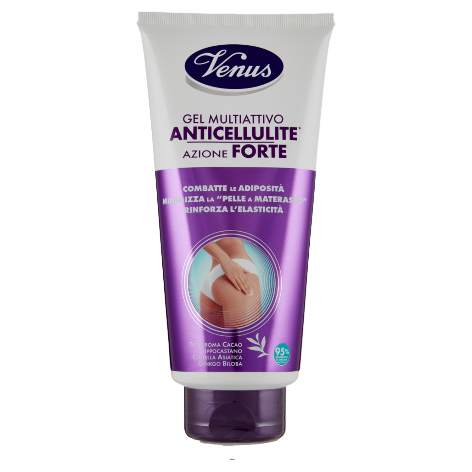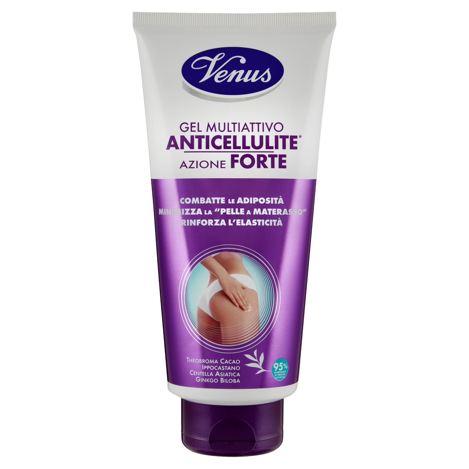 Da Venus una formula potenziata che utilizza l'esclusiva Tecnologia vegetale Venus, una tecnologia di estrazione degli attivi all'avanguardia, completamente naturale, che impiega solo acqua, senza solventi e calore, e consente di estrarre attivi più puri, più concentrati, più efficaci. Il nuovo Gel Multiattivo Anticellulite, formulato con il 95% di ingredienti di origine naturale, è un concentrato di attivi vegetali ad azione lipolitica e drenante che combatte, in modo ancora più efficace, inestetismi della cellulite, accumuli adiposi e rinforza l'elasticità della pelle. "Theobroma cacao" - "Aesculus hyppocastanum" - "Ginkgo Biloba" - "Centella asiatica" Risultati L'effetto "pelle a materasso" e gli accumuli adiposi si riducono progressivamente. Fianchi e cosce appaiono più sottili, i glutei più sodi, la linea più snella. Senza siliconi, oli minerali, derivati animali Testato sotto controllo clinico