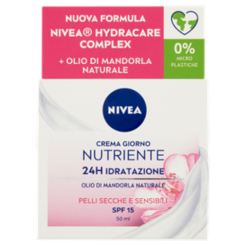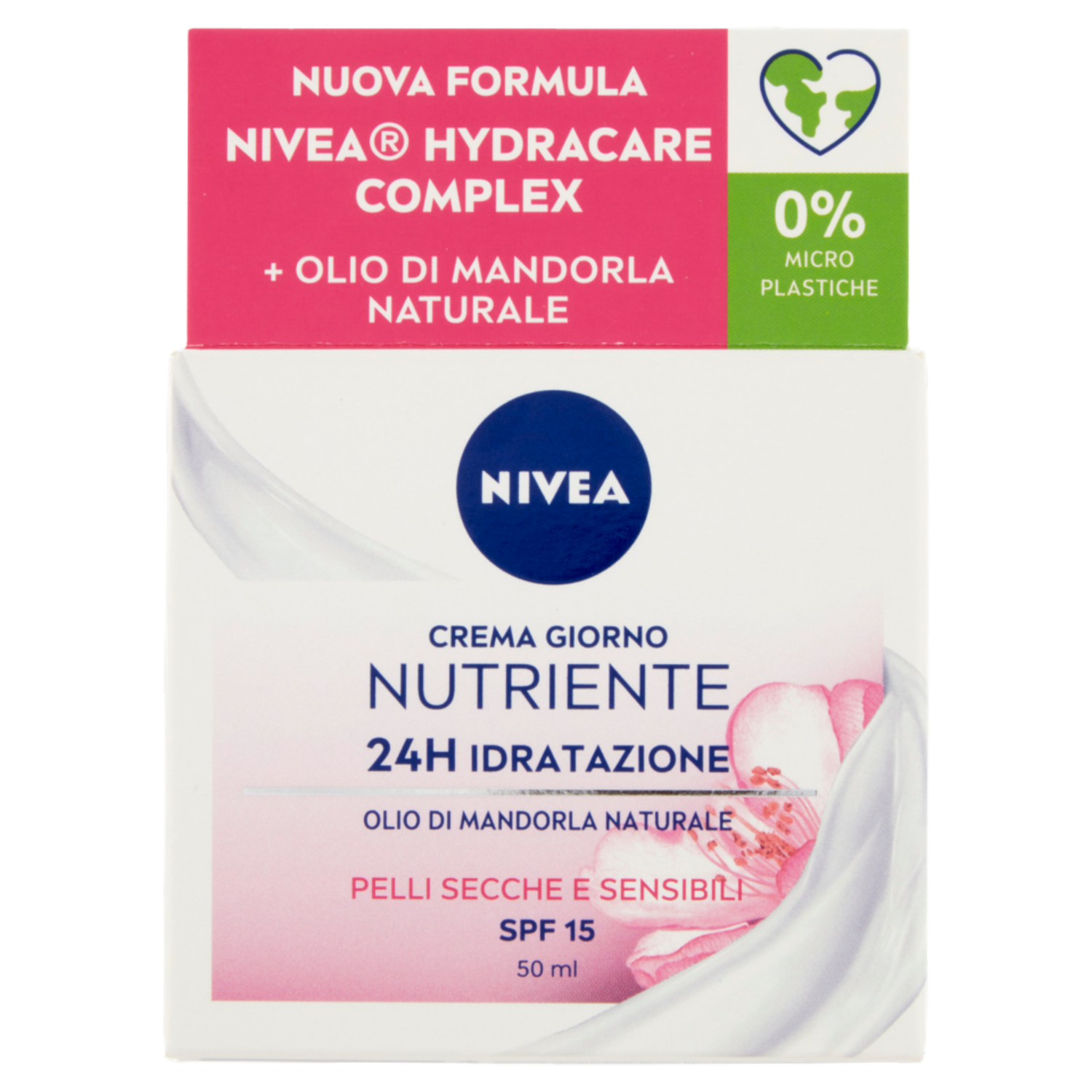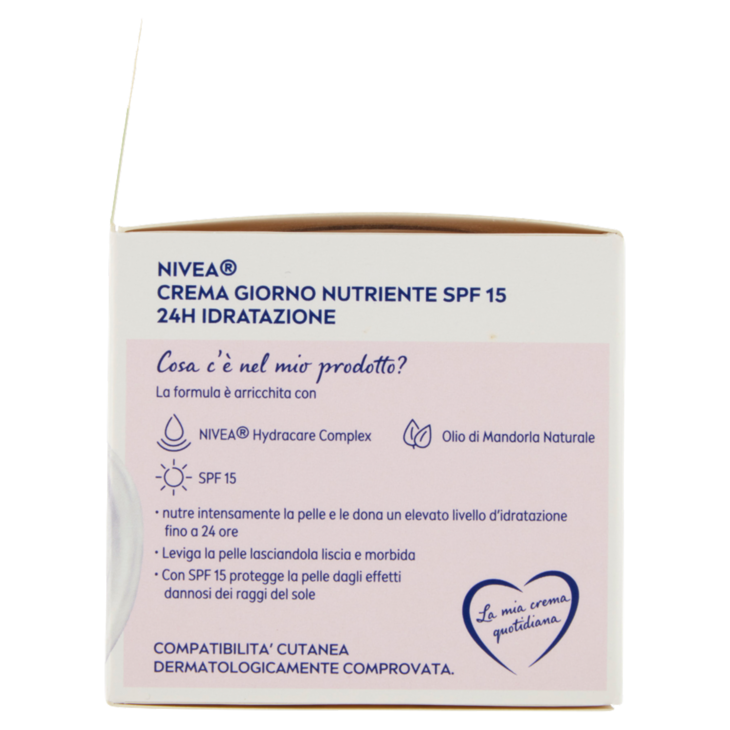 Per una pelle morbida e vellutata: La sua formula ricca, dalla texture setosa a rapido assorbimento idrata intensamente e protegge, per una pelle straordinariamente liscia e morbida. Nivea si prende cura della tua pelle & del pianeta - Formula senza microplastiche - Formula vegana* - Vaso completamente riciclabile** www.nivea.it/sostenibilita *Non sono presenti ingredienti di origine animale **escluso l'involucro protettivo tra la crema e il tappo Nivea Crema giorno nutriente SPF 15 24h idratazione Cosa c'è nel mio prodotto? La formula è arricchita con Nivea Hydracare Complex, Olio di Mandorla Naturale, SPF 15 - nutre intensamente la pelle e le dona un elevato livello d'idratazione fino a 24 ore - Leviga la pelle lasciandola liscia e morbida - Con SPF 15 protegge la pelle dagli effetti dannosi dei raggi del sole La mia crema quotidiana Compatibilità cutanea dermatologicamente comprovata.