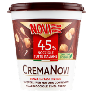 Crema Novi, autentica specialità, con il 45% di nocciole italiane selezionate. L'elevata quantità di nocciole conferisce naturalmente alla Crema Novi una spalmabilità ideale: da sempre senza aggiunta di grassi diversi da quelli per natura contenuti nelle nocciole e nel cacao. La Crema Novi è ricca di grassi insaturi, più salutari rispetto ai grassi saturi. * L'olio di nocciola in essa contenuto è costituito da un'elevata quantità di acido oleico, grasso monoinsaturo tipico dell'olio extravergine di oliva. * Nell'ambito di una dieta varia ed equilibrata e di uno stile di vita sano, la sostituzione nella dieta di grassi saturi con grassi insaturi contribuisce al mantenimento di livelli normali di colesterolo. (Gli acidi grassi monoinsaturi e polinsaturi sono grassi insaturi) Senza glutine