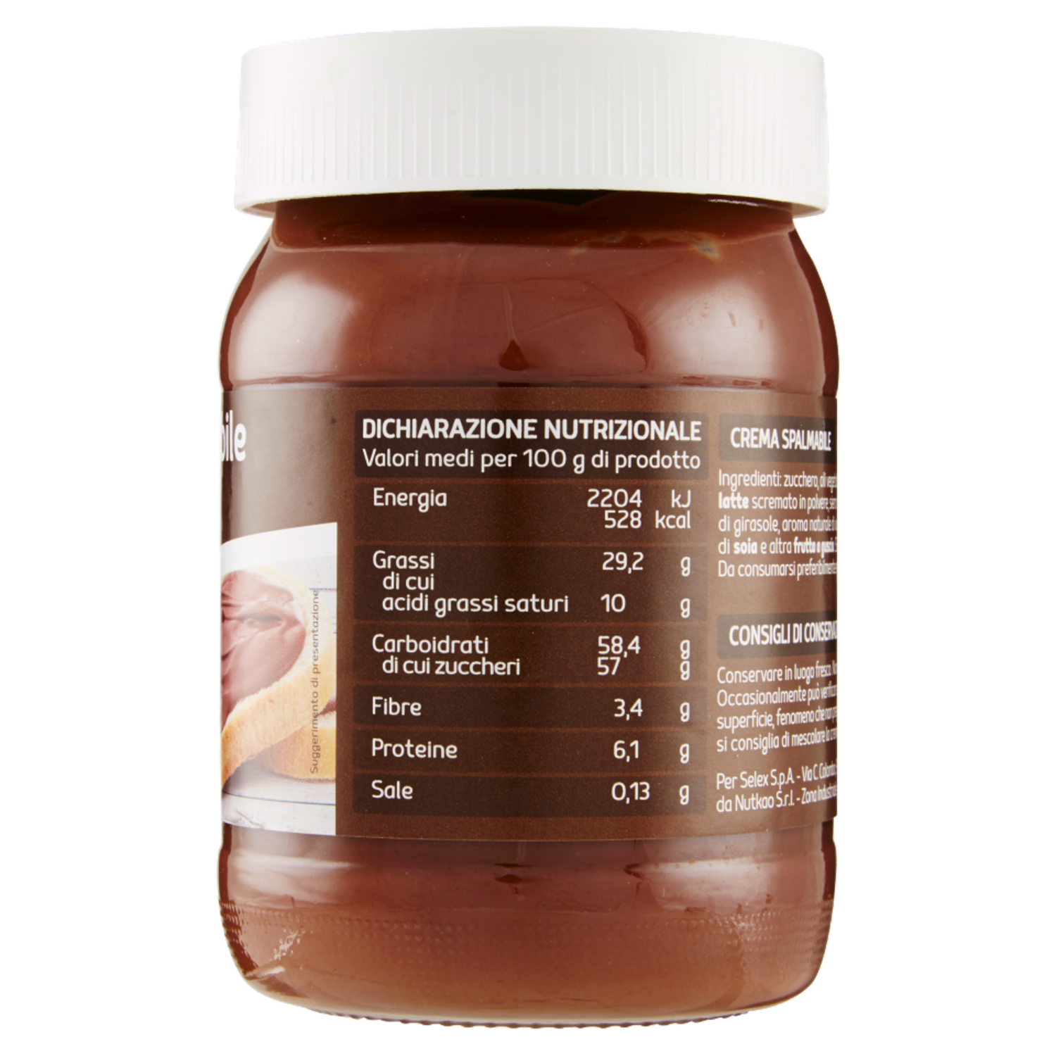 Consigli di conservazione Conservare in luogo fresco. Non mettere in frigorifero. Occasionalmente può verificarsi l'affioramento di olio in superficie, fenomeno che non pregiudica la qualità del prodotto; si consiglia di mescolare la crema prima di consumarla.
