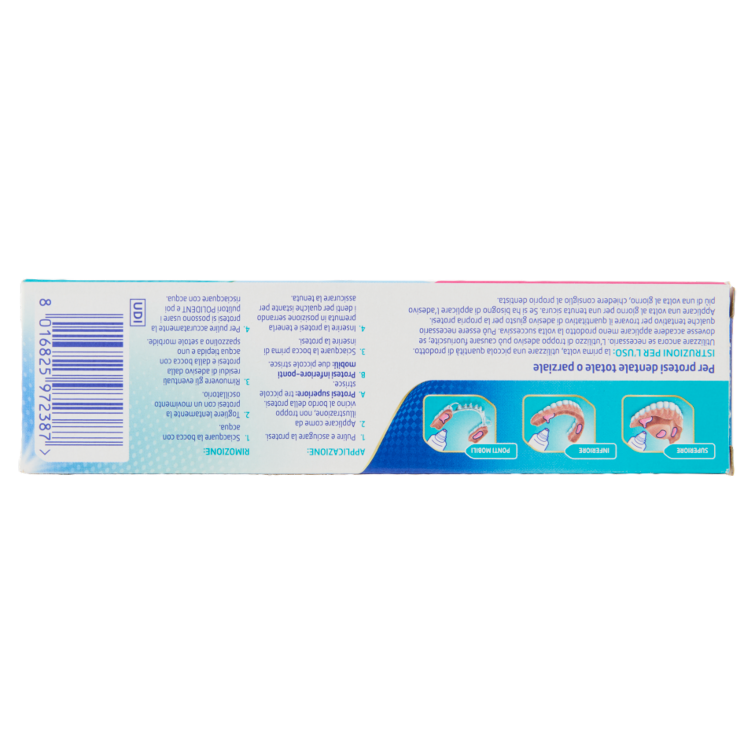AVVERTENZE E PRECAUZIONI: Tenere fuori dalla vista e dalla portata dei bambini. Alcuni soggetti potrebbero essere sensibili o allergici a questo prodotto. Se si verifica una reazione allergica o si avverte fastidio, sospendere l'uso immediatamente. Possono verificarsi altri effetti collaterali, come irritazione della bocca e sintomi gastrointestinali (ad es. nausea). L'ingestione di piccole quantità di prodotto, anche quando utilizzato secondo le istruzioni, può accadere e non è dannosa. Una protesi che non è ben adattata alle gengive può danneggiare la salute. Visitare regolarmente il dentista per controllare la corretta aderenza della protesi. Mantenere il tappo e il beccuccio asciutti, per evitare che l'erogatore si ostruisca. Richiudere il tappo dopo l'uso.