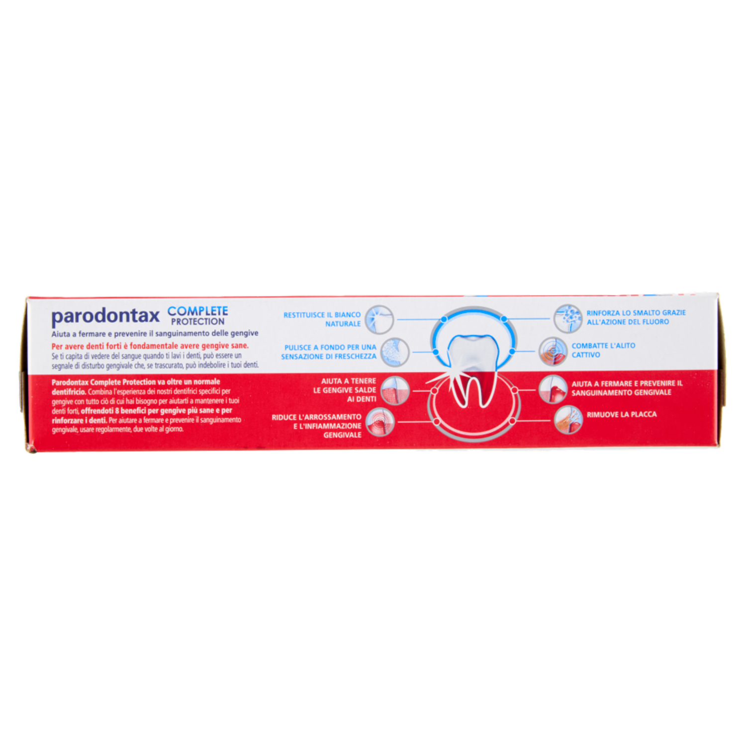 Aiuta a fermare e a prevenire il sanguinamento delle gengive Per avere denti forti è fondamentale avere gengive sane. Se ti capita di vedere del sangue quando ti lavi i denti, può essere un segnale di disturbo gengivale che, se trascurato, può indebolire i tuoi denti. Il nuovo parodontax Complete Protection va oltre un normale dentifricio. Combina l'esperienza dei nostri dentifrici specifici per gengive con tutto ciò di cui hai bisogno per aiutarti a mantenere i tuoi denti forti, offrendoti 8 benefici per gengive più sane e per rinforzare i denti.