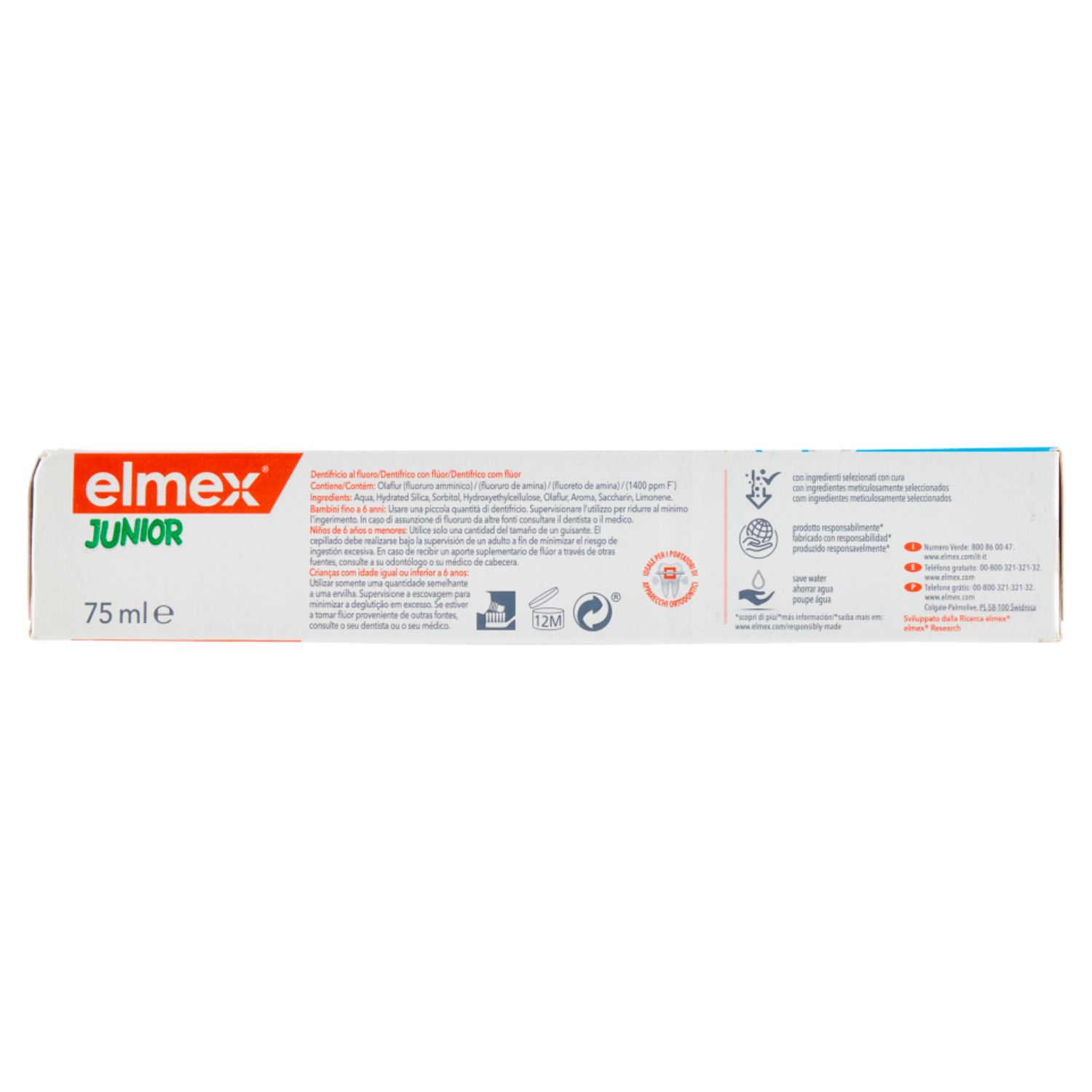 Per una completa igiene orale, usa prima il filo interdentale, poi il dentifricio elmex Protezione Carie Junior in combinazione con uno spazzolino elmex Junior, seguito da un collutorio elmex Junior. Chiedi al tuo dentista/igienista. con ingredienti selezionati con cura prodotto responsabilmente* save water *scopri di più: www.elmax.com/responsibly-made Sviluppato dalla Ricerca elmex