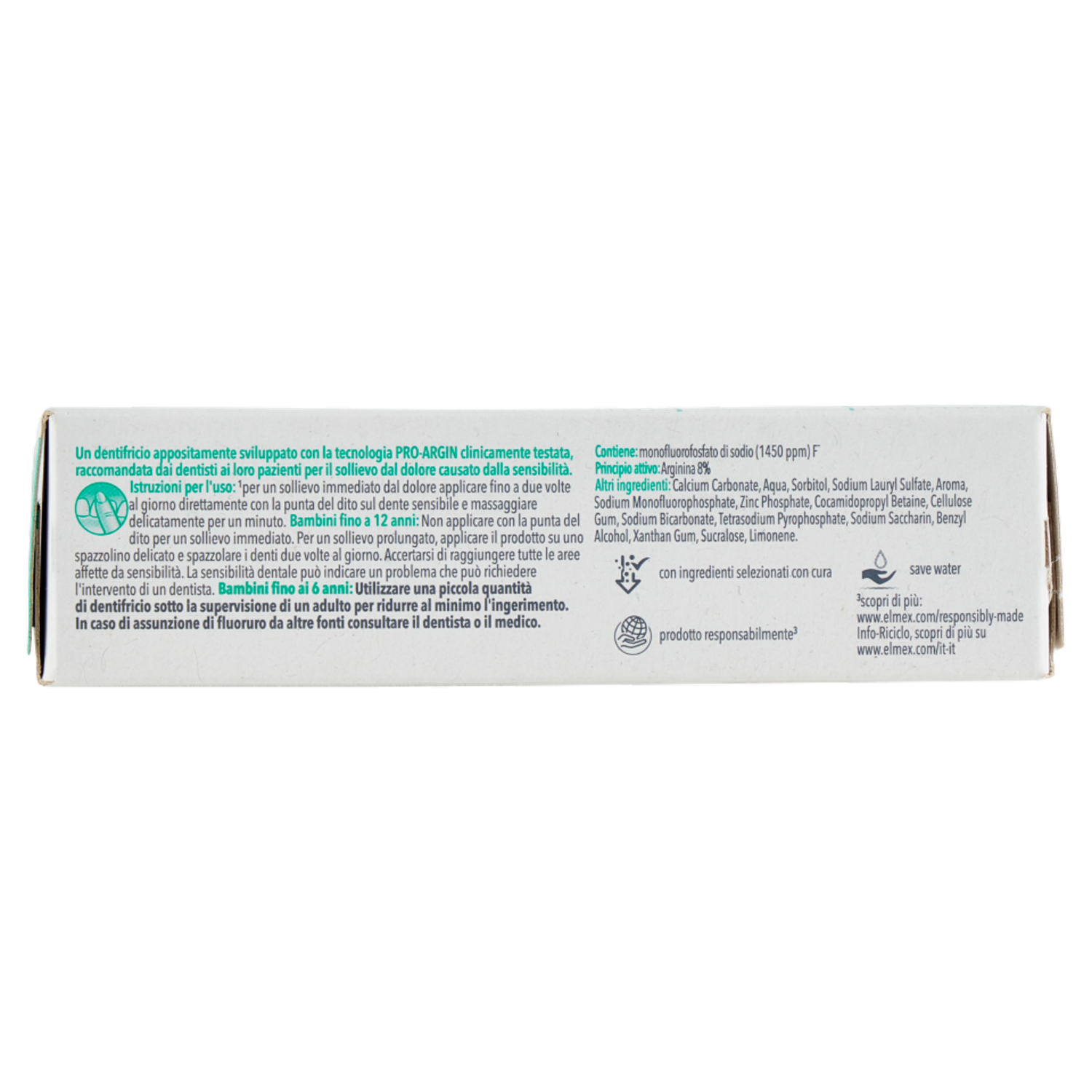 Istruzioni per l'uso: per un sollievo immediato dal dolore applicare fino a due volte al giorno direttamente con la punta del dito sul dente sensibile e massaggiare delicatamente per un minuto. Bambini fino a 12 anni: Non applicare con la punta del dito per un sollievo immediato. Per un sollievo prolungato, applicare il prodotto su uno spazzolino delicato e spazzolare i denti due volte al giorno. Accertarsi di raggiungere tutte le aree affette da sensibilità. La sensibilità dentale può indicare un problema che può richiedere l'intervento di un dentista. Bambini fino ai 6 anni: Utilizzare una piccola quantità di dentifricio sotto la supervisione di un adulto per ridurre al minimo l'ingerimento. In caso di assunzione di fluoruro da altre fonti consultare il dentista o il medico.