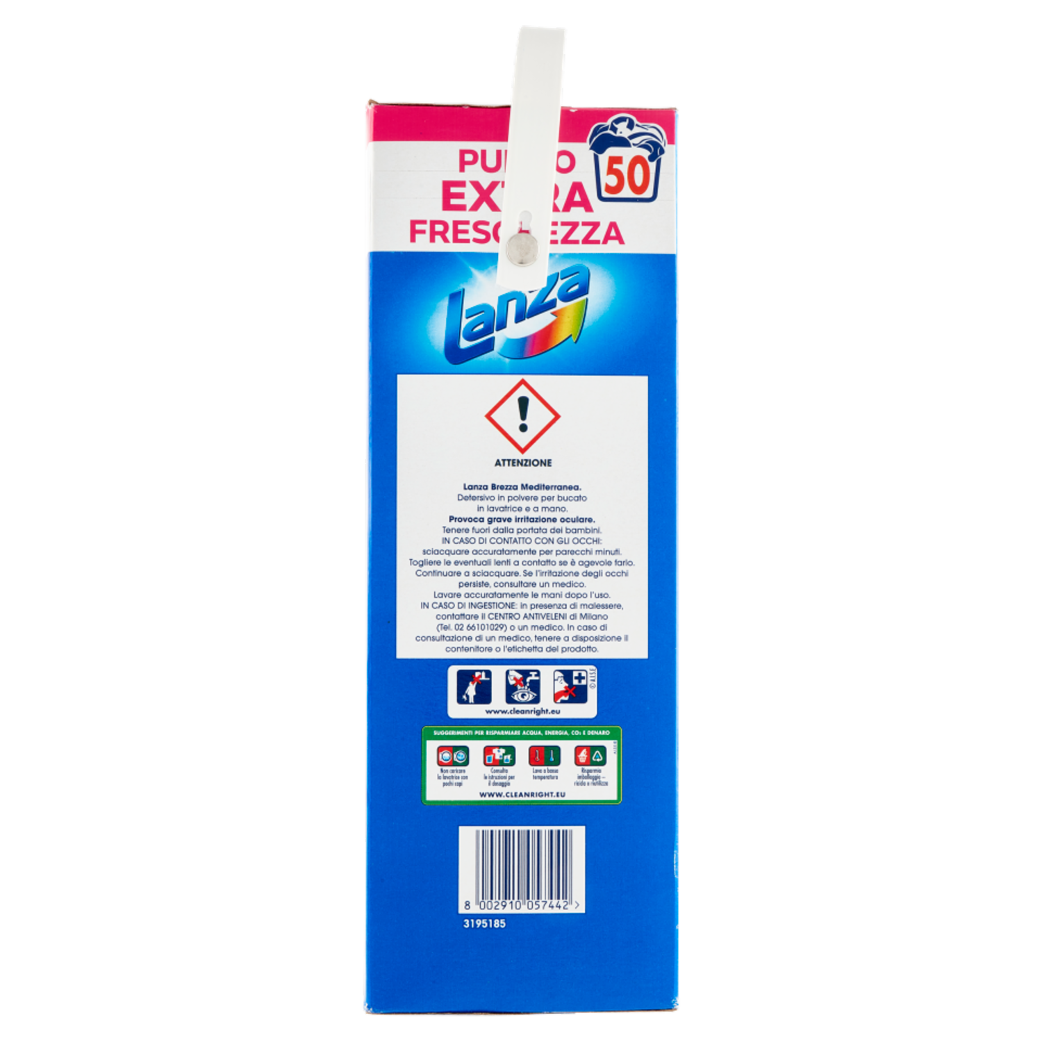 ATTENZIONE Lanza Brezza Mediterranea. Detersivo in polvere per bucato in lavatrice e a mano. Provoca grave irritazione oculare. Tenere fuori dalla portata dei bambini. IN CASO DI CONTATTO CON GLI OCCHI: sciacquare accuratamente per parecchi minuti. Togliere le eventuali lenti a contatto se è agevole farlo. Continuare a sciacquare. Se l'irritazione degli occhi persiste, consultare un medico. Lavare accuratamente le mani dopo l'uso. IN CASO DI INGESTIONE: in presenza di malessere, contattare il CENTRO ANTIVELENI di Milano (Tel. 02 66101029) o un medico. In caso di consultazione di un medico, tenere a disposizione il contenitore o l'etichetta del prodotto. A.I.S.E. www.cleanright.eu