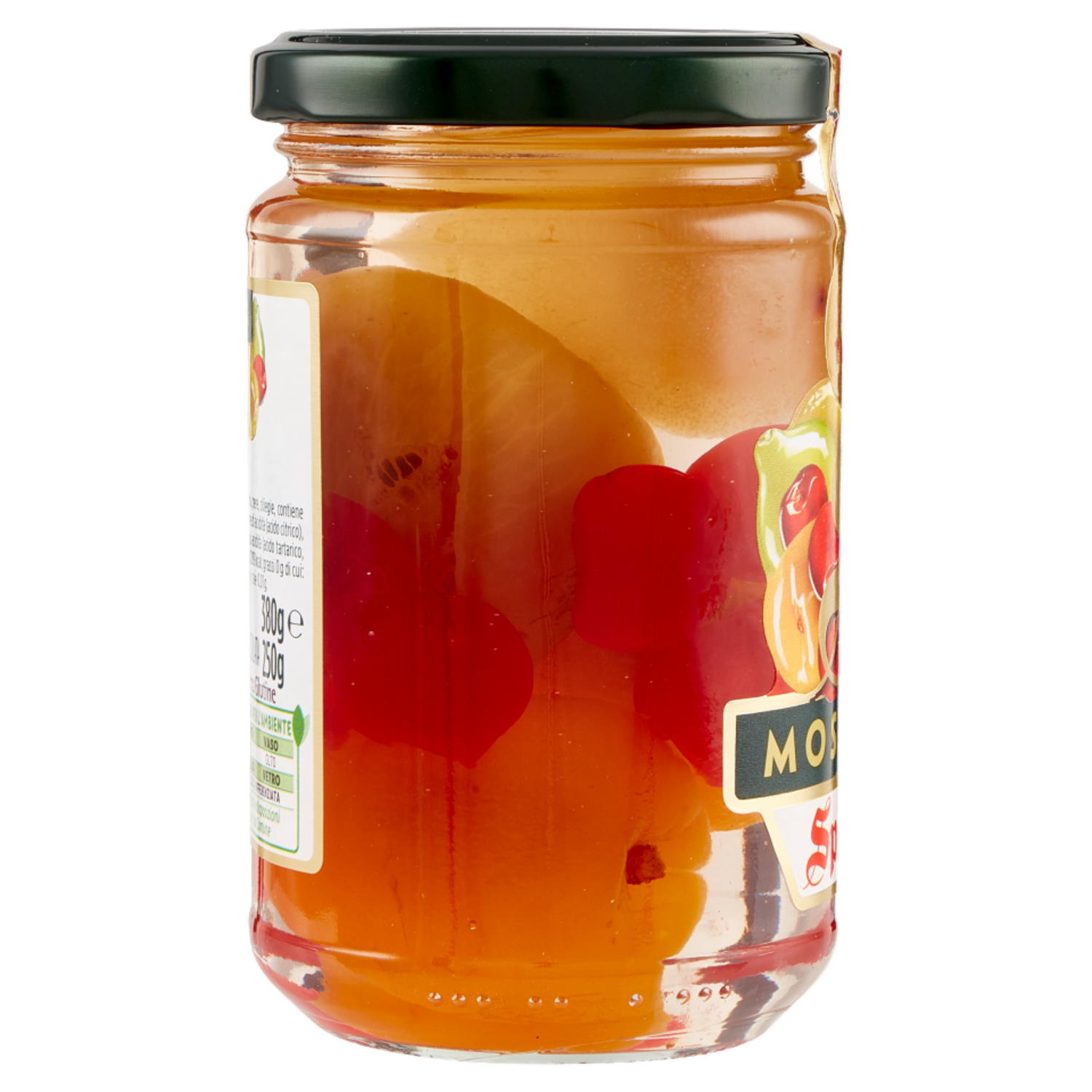 Frutta candita in proporzione variabile ((albicocche, fichi, pere, ciliegie, contiene anidride solforosa), sciroppo di glucosio-fruttosio, zucchero, correttore di acidità (acido citrico), colorante (E127))