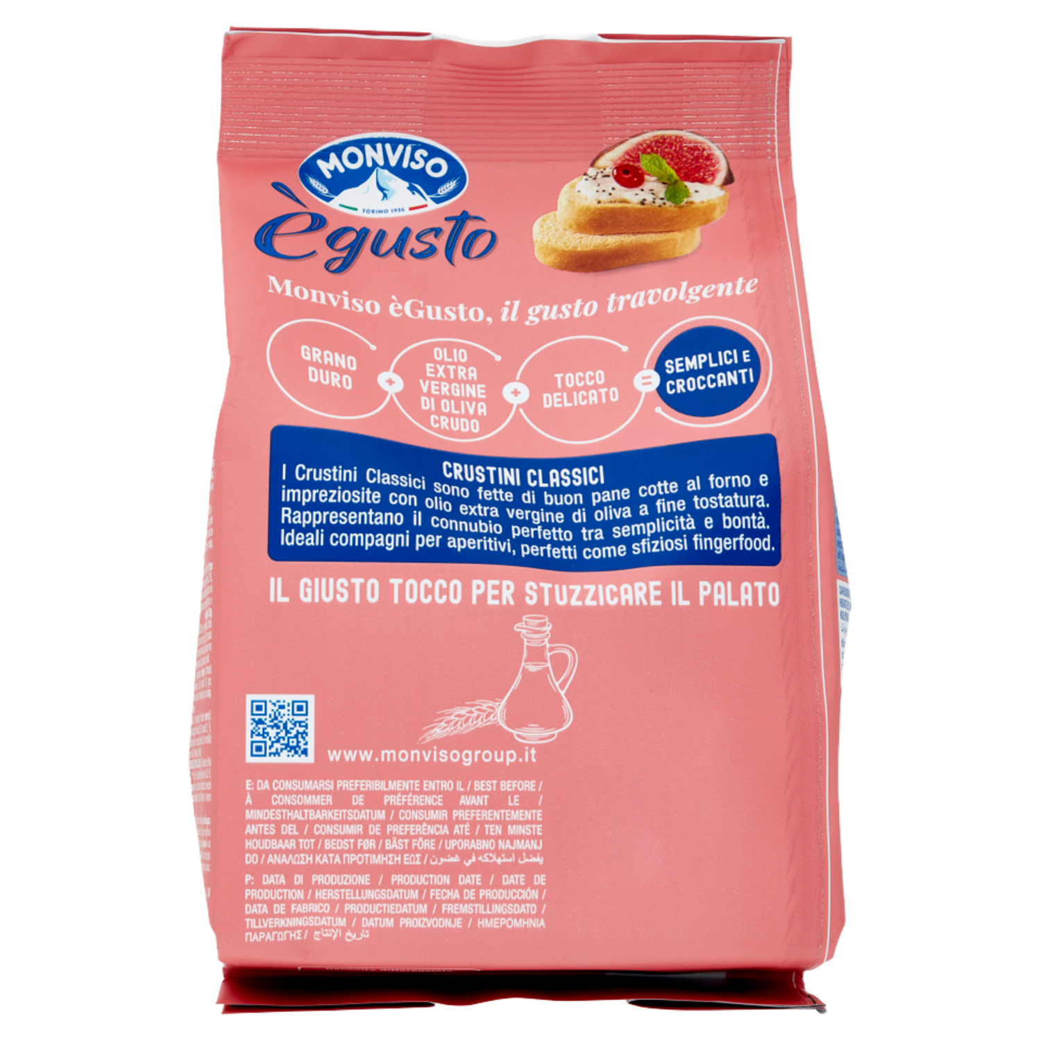 Monviso èGusto, il gusto travolgente Grano duro + Olio extra vergine di oliva crudo + Tocco delicato = Semplici e croccanti Crustini classici I Crustini Classici sono fette di buon pane cotte al forno e impreziosite con olio extra vergine di oliva a fine tostatura. Rappresentano il connubio perfetto tra semplicità e bontà. Ideali compagni per aperitivi, perfetti come sfiziosi fingerfood. Il giusto tocco per stuzzicare il palato
