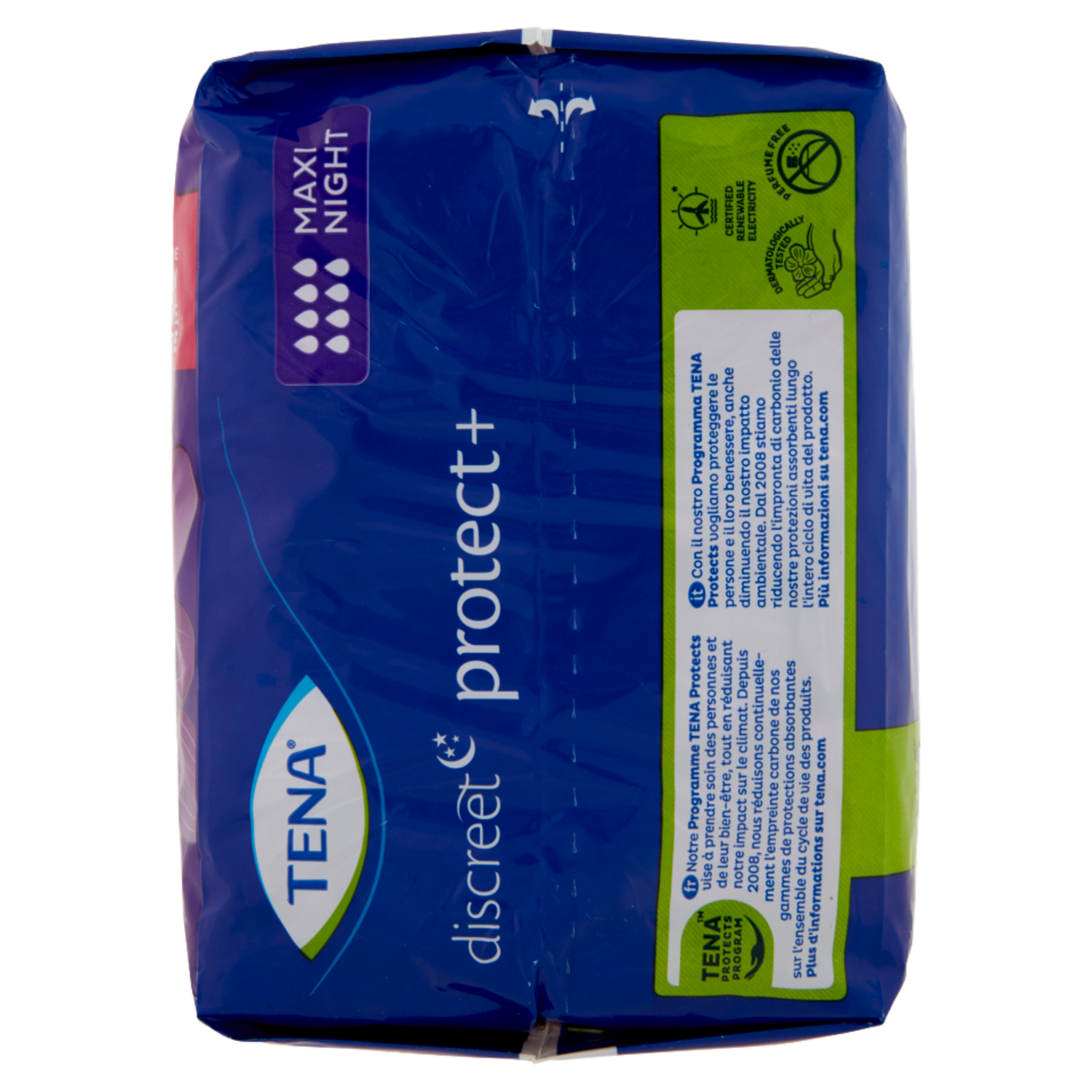 Tena Discreet Protect+ Maxi Night, con Tripla Protezione, è studiato per offrirti protezione da perdite urinarie pesanti e comfort durante il riposo notturno. Grazie alla parte posteriore più larga, ti offre una maggiore protezione quando sei in posizione distesa, per un riposo notturno sereno. La forma anatomica di questo assorbente si adatta facilmente al tuo corpo per offrirti maggiore protezione e comfort. Tena Discreet Protect + ti offre Triple Protection da perdite, odori e sensazione di bagnato sulla pelle.