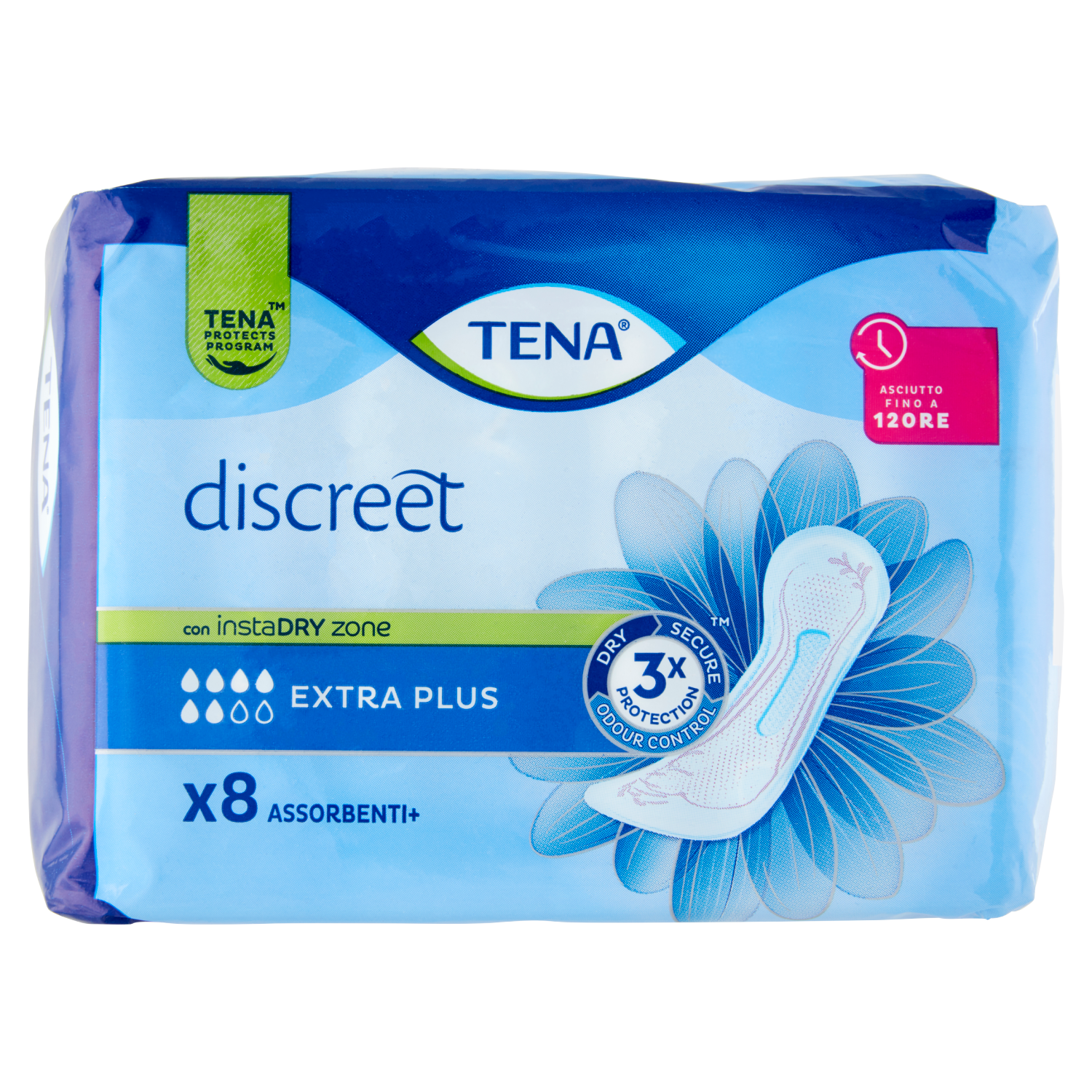Tena Discreet Assorbenti Extra Plus con Tripla Protezione offrono massima sicurezza, studiati per perdite urinarie moderate. La tecnologia instaDry assorbe i liquidi all'istante, allontanandoli dalla tua pelle e intrappolandoli all'interno dell'assorbente, lasciandoti asciutta fino a 12 ore. Offrendoti così protezione e sicurezza a lungo. Tena Discreet ti offre Tripla Protezione da perdite, odori e sensazione di bagnato sulla pelle.