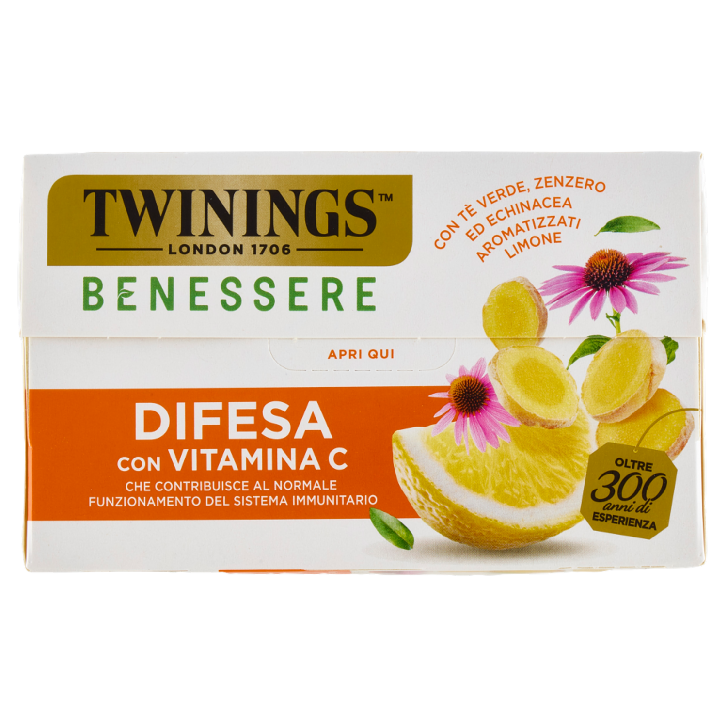 Lo sai che è importante mantenere le tue difese immunitarie? Benessere Difesa è la miscela Twinings pensata per te perché contiene vitamina C che contribuisce al normale funzionamento del sistema immunitario e favorisce il tuo benessere. Una miscela dal gusto brioso di limone, che combina le proprietà di tè verde, zenzero ed echinacea. La vitamina C contribuisce al normale funzionamento del sistema immunitario Prendi una buona abitudine per il tuo benessere quotidiano! Nell'ambito di una dieta varia ed equilibrata e di uno stile di vita sano, di cui ti ricordiamo l'importanza, ti consigliamo di bere almeno una tazza al giorno.