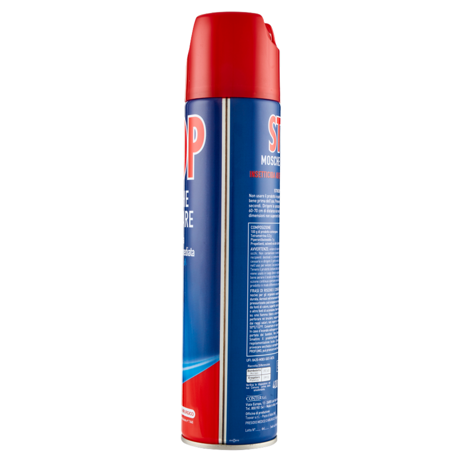 PERICOLO AVVERTENZE: evitare di inalare direttamente il getto e di spruzzarlo negli occhi. Non contaminare durante l'uso con il prodotto alimenti, bevande o recipienti destinati a contenerne. Ripetere il trattamento solo quando necessario e dirigere il getto verso l'alto, lontano dalle persone. Non eccedere nell'uso per evitare l'accumulo nell'aria di gas estremamente infiammabile. Tenere il prodotto lontano dalla portata degli animali domestici. Se il prodotto viene usato in luogo dove si soggiorna lungamente o nelle camere da letto è bene aerare il locale prima di soggiornarvi nuovamente. È sconsigliata l'esposizione continua a persone sensibili (bambini, asmatici, ecc.). Non utilizzare il prodotto in modo differente da come indicato in etichetta. FRASI DI RISCHIO E CONSIGLI DI PRUDENZA: nocivo per gli organismi acquatici con effetti di lunga durata. Aerosol estremamente infiammabile. Contenitore pressurizzato: può scoppiare se riscaldato. Tenere lontano da fonti di calore, superfici calde, scintille, fiamme libere o altre fonti di accensione. Non fumare. Non vaporizzare su una fiamma libera o altra fonte di accensione. Non perforare né bruciare, neppure dopo l'uso. Proteggere dai raggi solari; non esporre a temperature superiori a 50°C/122°F. Conservare in luogo fresco e ben ventilato. In caso d'incendio estinguere con CO₂. Tenere fuori dalla portata dei bambini. Non disperdere nell'ambiente. Smaltire il prodotto/recipiente in conformità alla regolamentazione locale. L'esposizione ripetuta può provocare secchezza o screpolature della pelle. Contiene PROFUMO, può provocare una reazione allergica. UFI: 8A20-M083-S001-HQTA Presidio Medico Chirurgico - Registrazione del Ministero della Salute n° 7.065