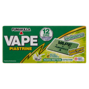 ATTENZIONE Piastrina verdessenza Ricarica piastrina insetticida INDICAZIONI DI PERICOLO: Può provocare una reazione allergica della pelle. Molto tossico per gli organismi acquatici con effetti di lunga durata. CONSIGLI DI PRUDENZA: in caso di consultazione di un medico, tenere a disposizione il contenitore o l'etichetta del prodotto. Tenere fuori dalla portata dei bambini. Non disperdere nell'ambiente. Indossare guanti. In caso di irritazione o eruzione della pelle, consultare un medico. Smaltire il prodotto/recipiente in accordo alla normativa locale vigente. Contiene: Olio essenziale di Eucaliptus. Presidio Medico Chirurgico Reg. n. 20250 del Ministero della Salute. UFI: 9GKU-8AWD-Y60X-DU7X PRECAUZIONI D'USO: Leggere attentamente l'etichetta prima dell'uso. Evitare il contatto con gli occhi. IN CASO DI CONTATTO CON LA PELLE: lavare abbondantemente con acqua e sapone. Evitare di respirare i fumi. Non tenere in funzione l'apparecchio durante la permanenza in ambienti chiusi e aerare il locale prima di soggiornarvi nuovamente. Se il prodotto viene impiegato in luogo dove si soggiorna lungamente o nelle camere da letto aerare sufficientemente il locale prima di soggiornarvi nuovamente. Conservare lontano da alimenti, mangimi e bevande. Non mangiare, né bere, né fumare durante l'uso. Evitare l'esposizione continua a persone sensibili (bambini, asmatici, ecc.). Non toccare la piastra riscaldante durante e subito dopo l'uso onde evitare possibili scottature. Non tenere l'elettroemanatore a contatto con tessuti o materiali combustibili in genere quando è in funzione. INFORMAZIONI PER IL MEDICO: Il prodotto contiene Pralletrina (piretroide di sintesi), i cui sintomi si riferiscono ad un blocco della trasmissione nervosa. TERAPIA: sintomatica in caso di ingestione - Consultare un Centro Antiveleni (Tel. 02/66101029).