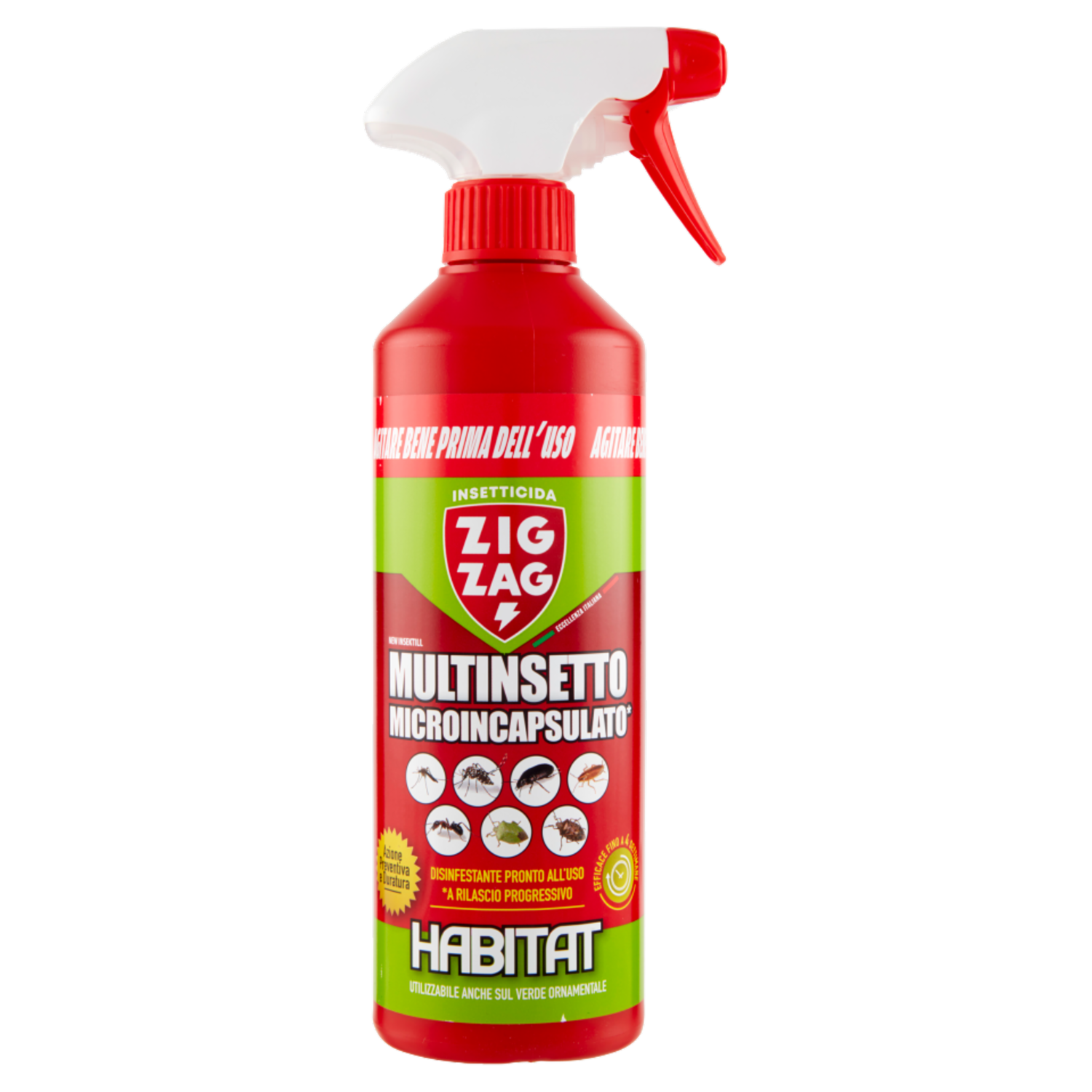 Agitare bene prima dell'uso Istruzioni per l'uso: Agitare bene prima dell'uso. Il prodotto è pronto all'impiego. Applicare per irrorazione sulle superfici da trattare con trattamenti spot da una distanza di circa 30 cm impiegando 30 g di prodotto per mq (circa 30 spruzzate). Lasciare asciugare. Si suggerisce di applicare il prodotto preferibilmente nei punti dove gli insetti passano o si nascondono, dietro i mobili, sotto gli elettrodomestici, sulle soglie di finestre e porte esterne, ecc.. Non applicare su superfici che vengono lavate di frequente per non perdere le capacità residuali del prodotto. Nei trattamenti sul verde ornamentale per il controllo delle zanzare mantenere le dose indicata evitando il gocciolamento dalla vegetazione. Il prodotto può essere applicato anche su superfici porose o imbiancate di recente. Una volta asciutto, potrebbe comparire un residuo bianco composto dalle microcapsule contenenti il principio attivo che può essere facilmente rimosso senza lasciare macchie.