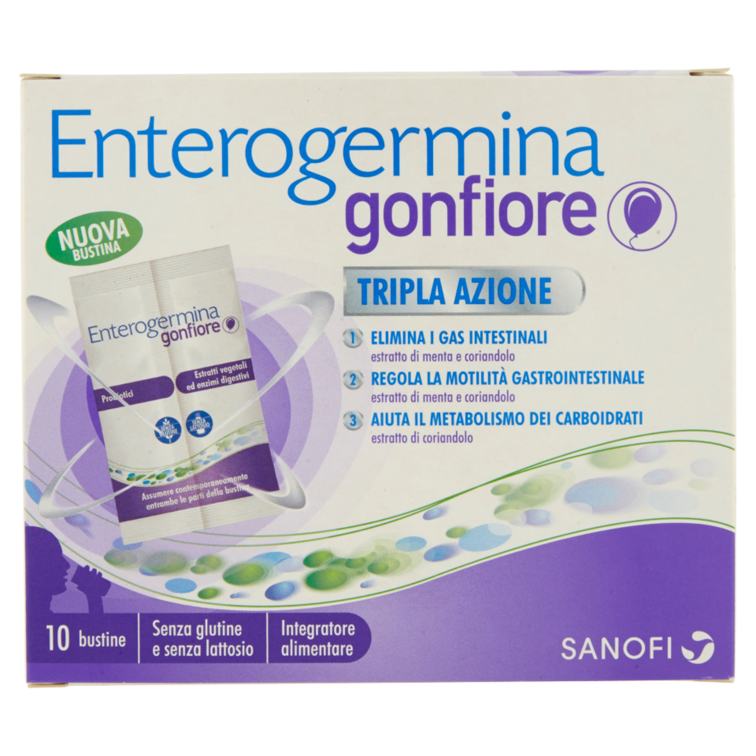 Senza glutine - Senza lattosio Enterogermina gonfiore è un integratore alimentare con formulazione specifica a base di probiotici, estratti vegetali ed enzimi digestivi. Indicazioni d'uso: l'azione del probiotico favorisce l'equilibrio della flora batterica intestinale, gli estratti vegetali di menta e coriandolo aiutano la regolare motilità intestinale e l'eliminazione dei gas che causano il gonfiore addominale. L'estratto di coriandolo aiuta il metabolismo dei carboidrati.