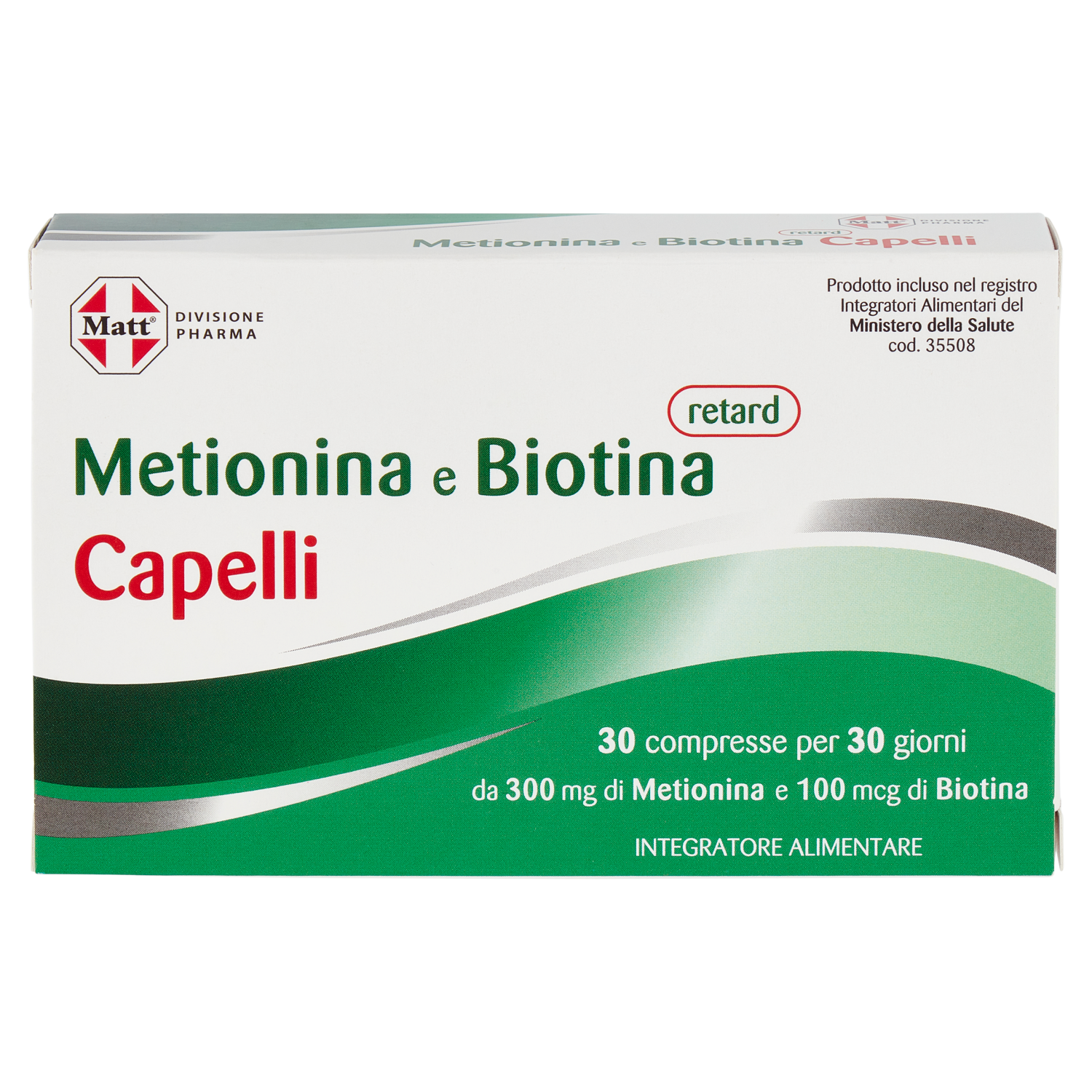 Metionina e Biotina retard Capelli è un integratore alimentare di Metionina, Vitamine e Minerali a rilascio prolungato (azione retard). La Metionina entra a far parte della struttura della cheratina, sostanza fondamentale di capelli e unghie. La Biotina, insieme allo Zinco, contribuisce al mantenimento di capelli normali. Il Rame contribuisce alla normale pigmentazione dei capelli. Le Vitamine ne arricchiscono la formulazione. Ogni compressa contiene 300 mg di Metionina e 100 mcg di Biotina