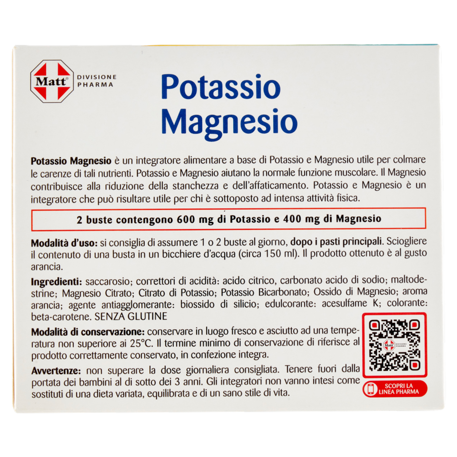 Potassio Magnesio è un integratore alimentare a base di Potassio e Magnesio utile per colmare le carenze di tali nutrienti. Potassio e Magnesio aiutano la normale funzione muscolare. Il Magnesio contribuisce alla riduzione della stanchezza e dell'affaticamento. Potassio e Magnesio è un integratore che può risultare utile per chi è sottoposto ad intensa attività fisica. 2 buste contengono 600 mg di Potassio e 400 mg di Magnesio