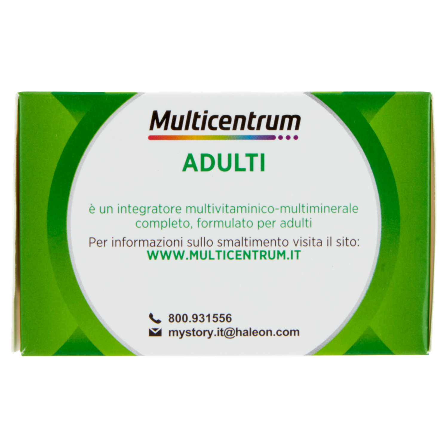 Senza glutine Senza zuccheri Specificatamente formulato per adulti Con le Vitamine B6 e B12 che contribuiscono alla riduzione di stanchezza e fatica Con Vitamine B6, B12 e C che contribuiscono alla normale funzione del sistema immunitario Con Vitamine A, B2 e Biotina che contribuiscono al mantenimento di una pelle sana Con Vitamine C, E e Selenio che contribuiscono alla protezione delle cellule dallo stress ossidativo Multicentrum Adulti è un integratore multivitaminico-multiminerale completo, formulato per adulti