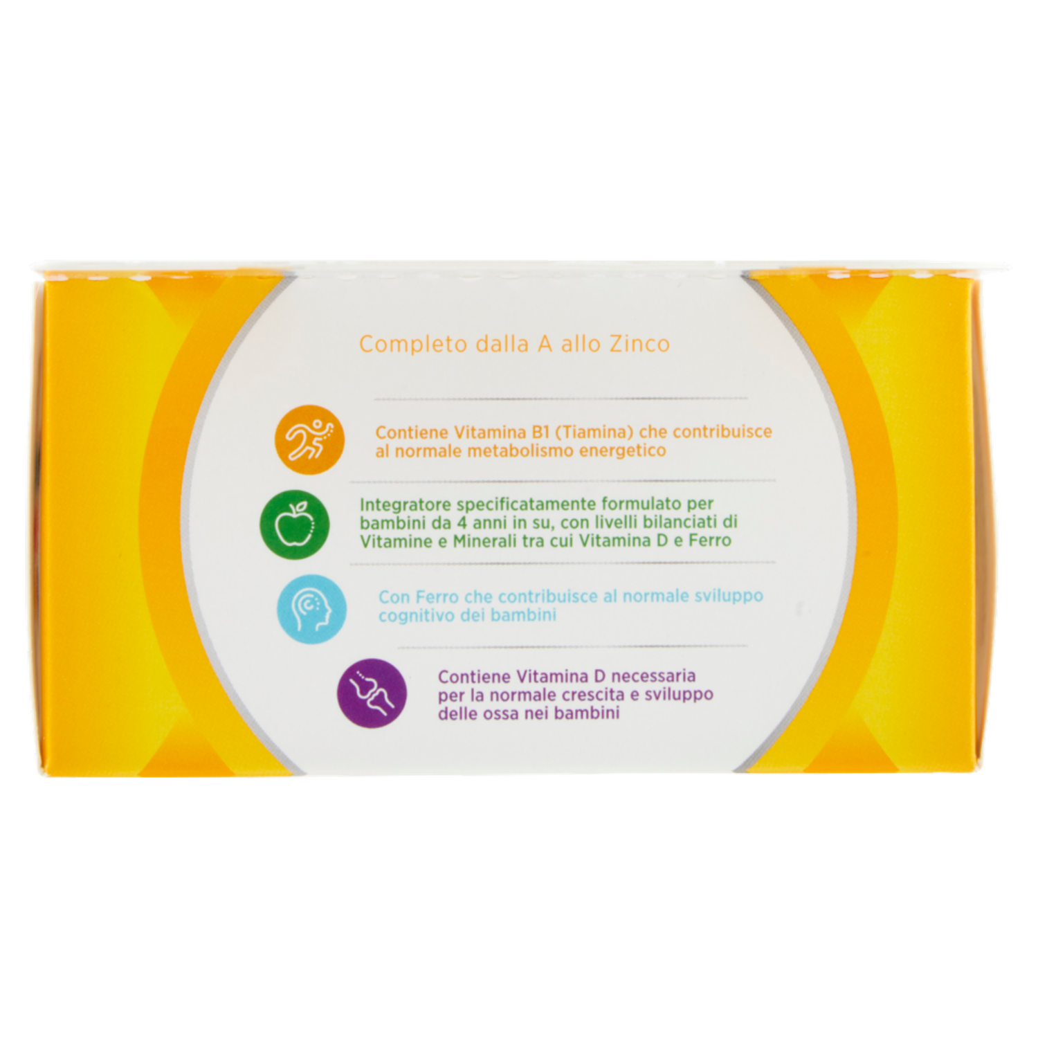 Senza glutine Senza zuccheri Completo dalla A allo Zinco Contiene Vitamina B1 (Tiamina) che contribuisce al normale metabolismo energetico Integratore specificatamente formulato per bambini da 4 anni in su, con livelli bilanciati di Vitamine E Minerali tra cui Vitamina D e Ferro Con Ferro che contribuisce al normale sviluppo cognitivo dei bambini Contiene Vitamina D necessaria per la normale crescita e sviluppo delle ossa nei bambini Multicentrum junior 4+ Anni è un integratore alimentare multivitaminico-multiminerale specificatamente formulato in compresse masticabili per bambini. È indicato nei casi di ridotto apporto con la dieta di tali sostanze o di aumento del loro fabbisogno fisiologico.