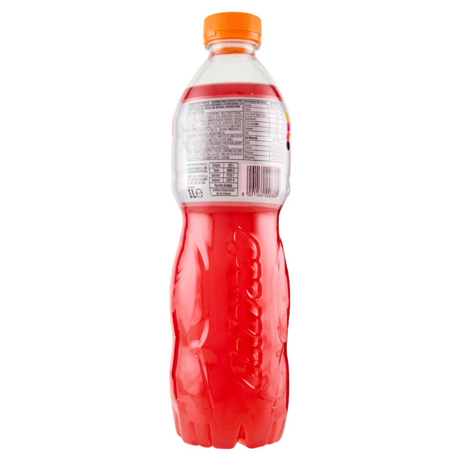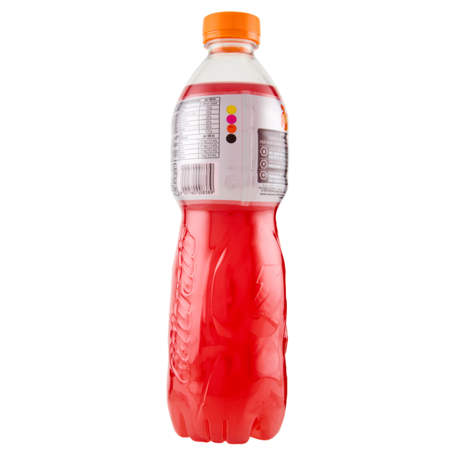 Prodotto per sportivi - Bevanda non gassata con zuccheri ed edulcoranti destinata a reintegrare le perdite idrosaline dovute ad intensa sudorazione - Gusto arancia rossa