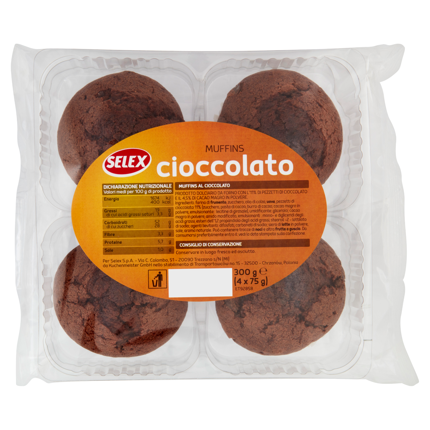 Muffins al cioccolato Prodotto dolciario da forno con l'11% di pezzetti di cioccolato e il 4,5% di cacao magro in polvere