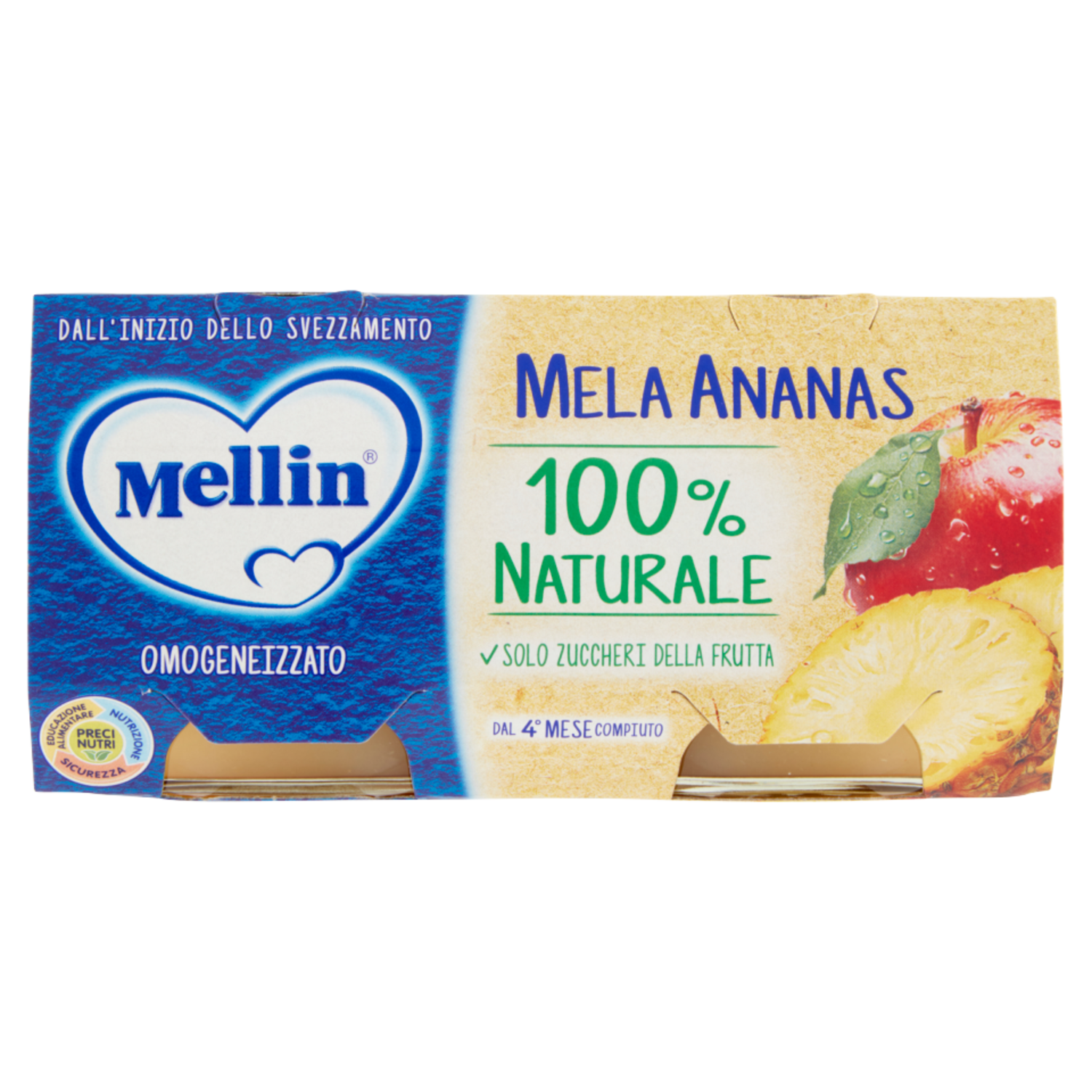 Mellin 100% Naturale è: - Bontà al naturale Solo zuccheri della frutta Senza aromi - Con ingredienti di origine naturale e vit. C, selezionati e preparati con cura - Senza conservanti e coloranti come per legge Il latte materno è l'alimento ideale per il lattante e si raccomanda in forma esclusiva nei primi 6 mesi. Consultare il Pediatra quando s'intenda iniziare lo svezzamento. Scegliendo Mellin, scegli PreciNutri, l'esclusivo programma che ricerca la Precisione Nutrizionale nei suoi prodotti, per rispondere alle esigenze specifiche del tuo bambino in ogni fase della sua crescita. Precinutri - Educazione Alimentare, Nutrizione, Sicurezza Solo zuccheri della frutta Ricco di vitamina C Oltre 40.000 controlli all'anno sui nostri omogeneizzati di frutta