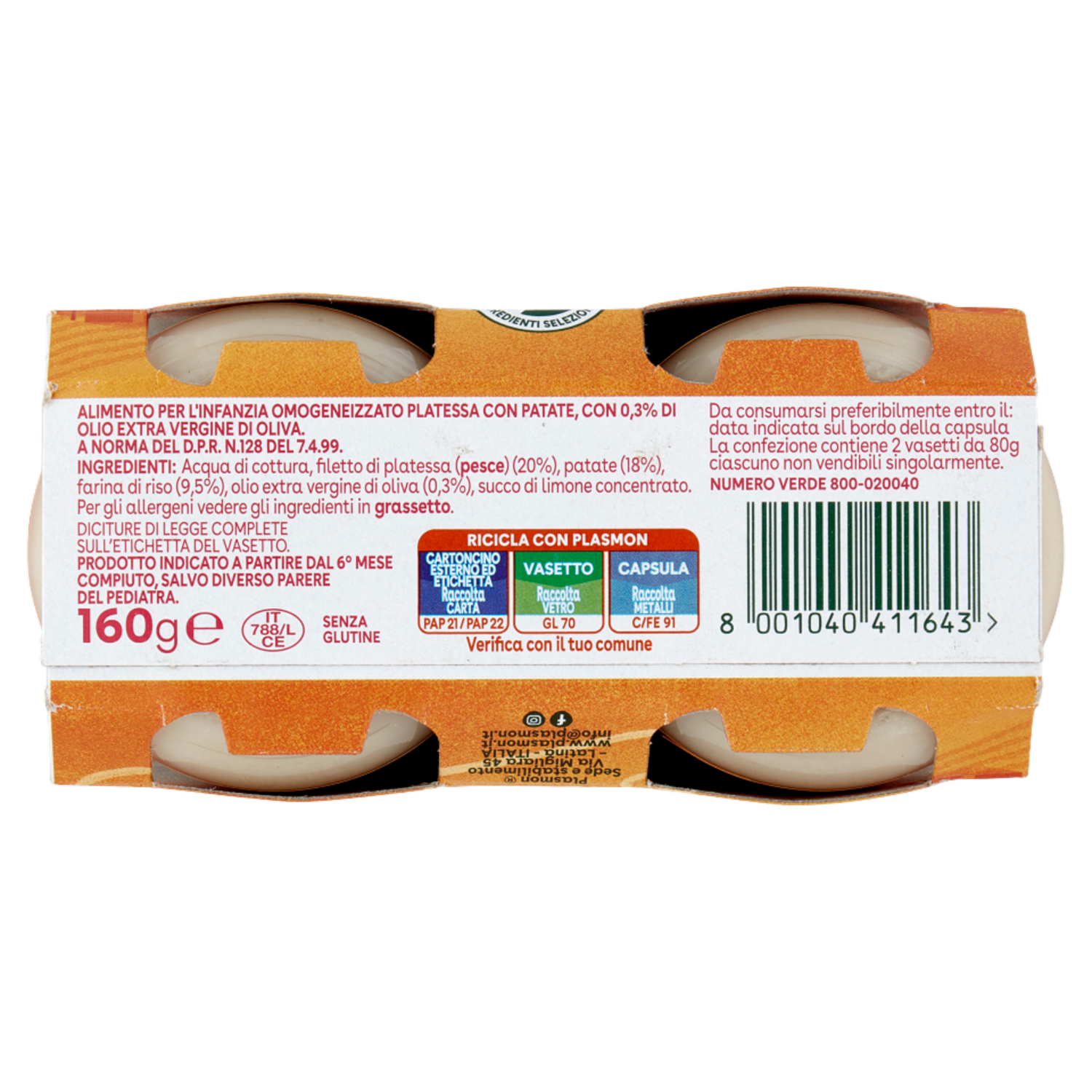 Alimento per l'infanzia omogeneizzato platessa con patate, con 0,3% di olio extra vergine di oliva A norma del D.P.R. n.128 del 7.4.99