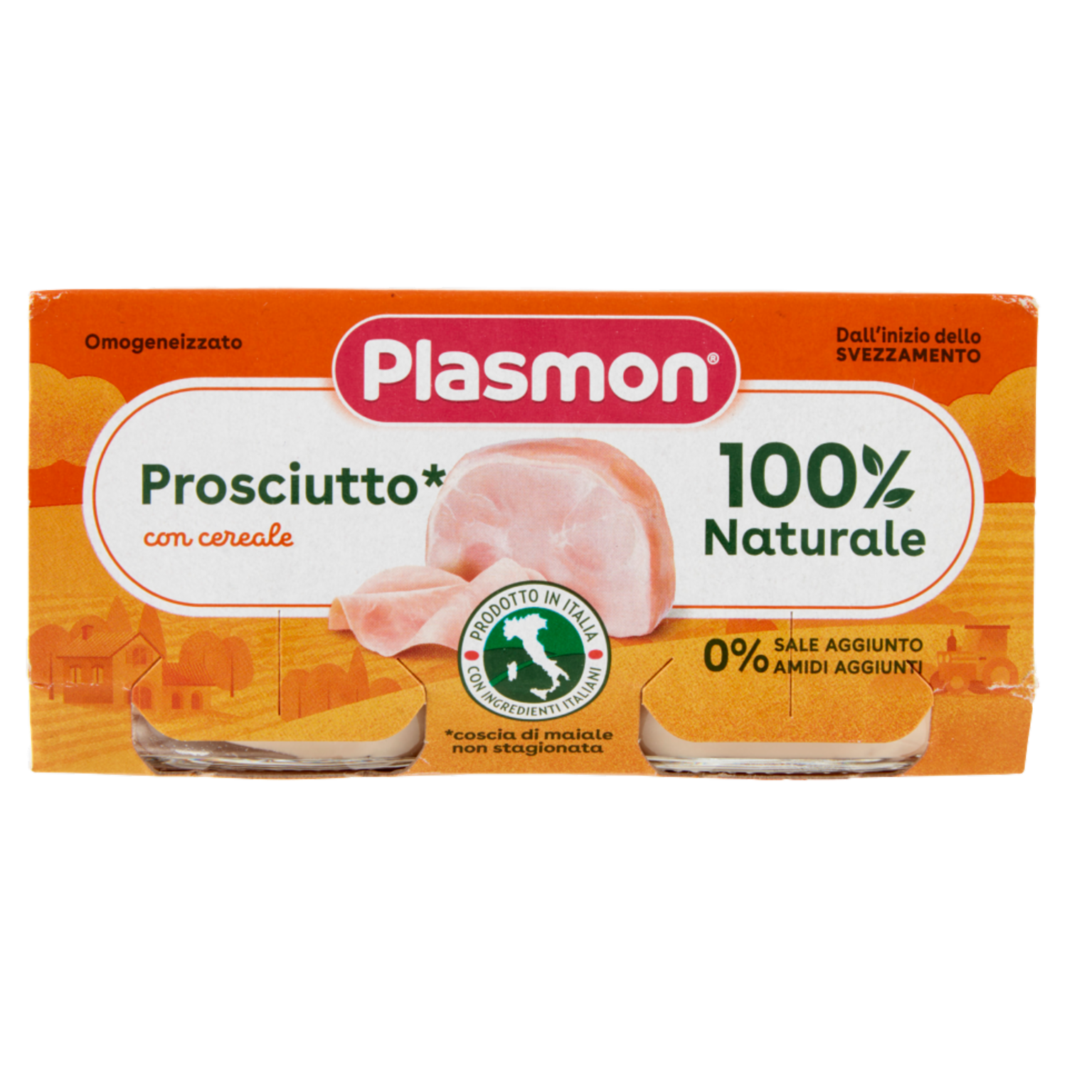 Alimento per l'infanzia omogeneizzato con prosciutto* e cereale A norma del D.P.R. n.128 del 7.4.99 *coscia di maiale non stagionata
