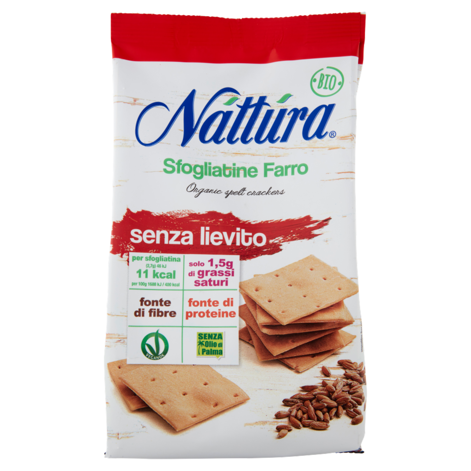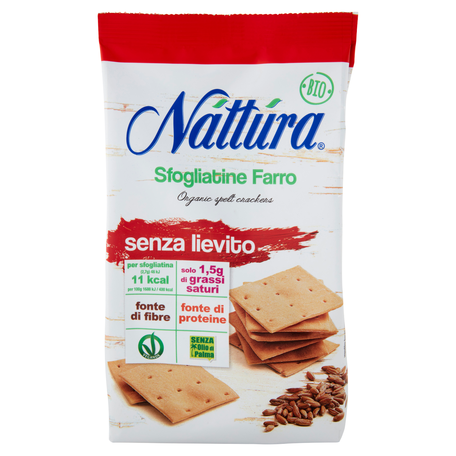 - Bassi grassi saturi - Fonte di fibre - Senza lievito - Fonte di proteine - Solo 11 kcal per sfogliatina - Senza olio di palma Le Sfogliatine Farro Náttúra da agricoltura biologica sono senza lievito, senza olio di palma e a basso contenuto di grassi saturi. Hanno 11 kcal per sfogliatina e sono una preziosa fonte di fibre e proteine. Perfette come sostitutivo del pane o per uno spuntino sano e sfizioso.